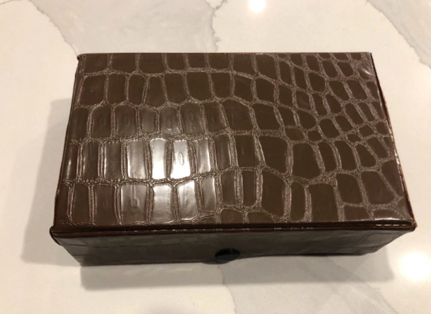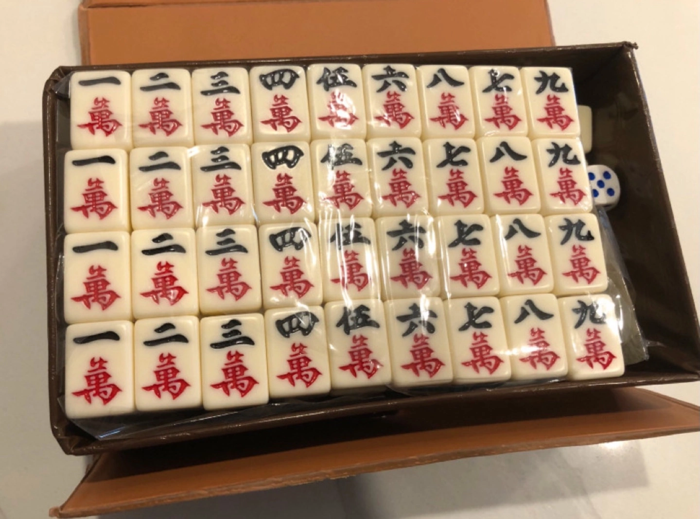 Complete mahjong set. Includes tiles and dice. Brown faux-crocodile carrying case. Brand new in package