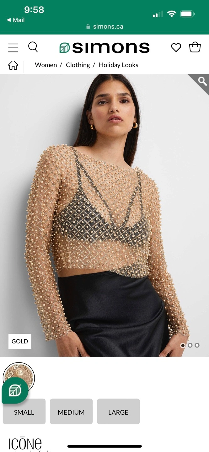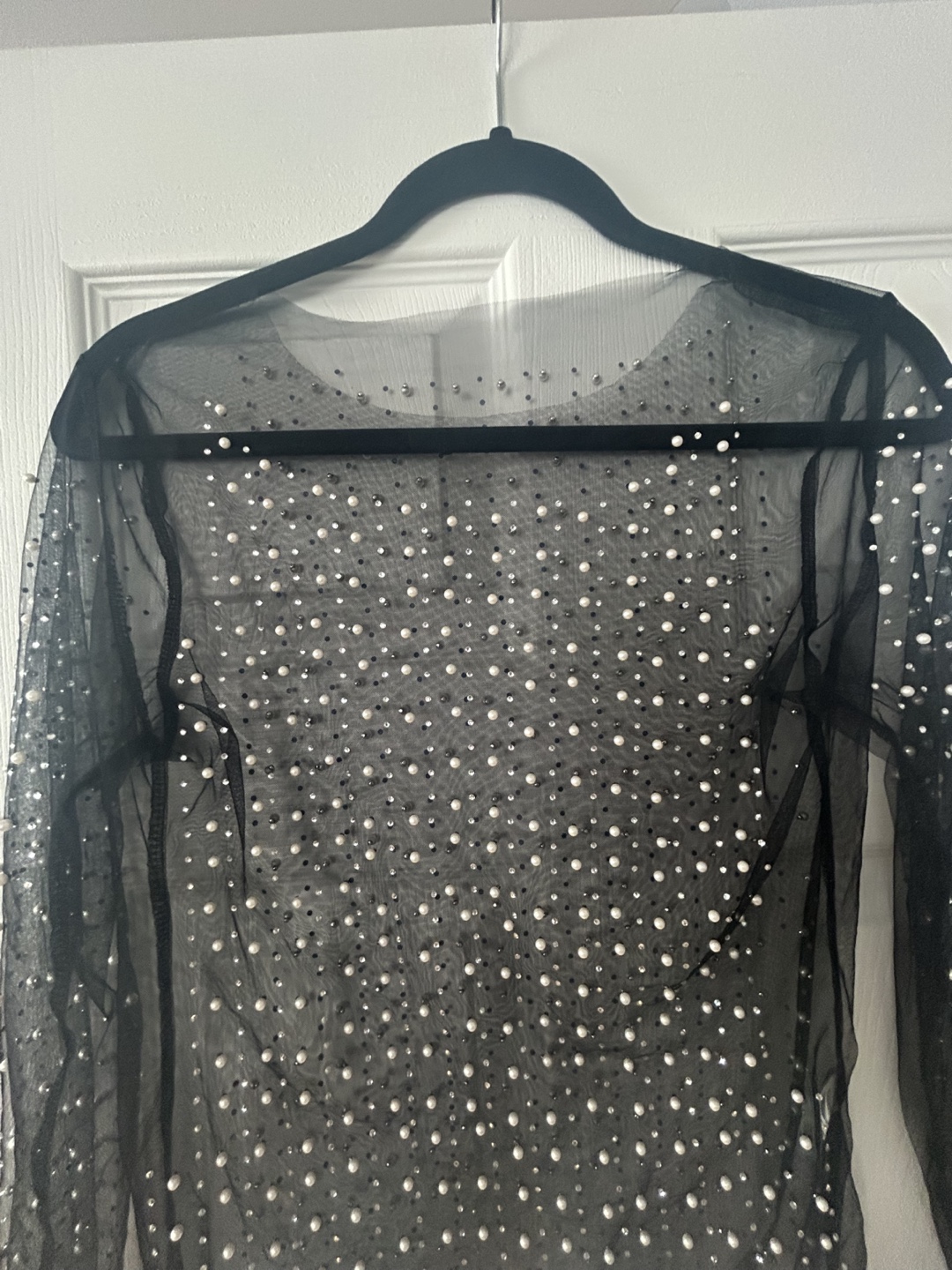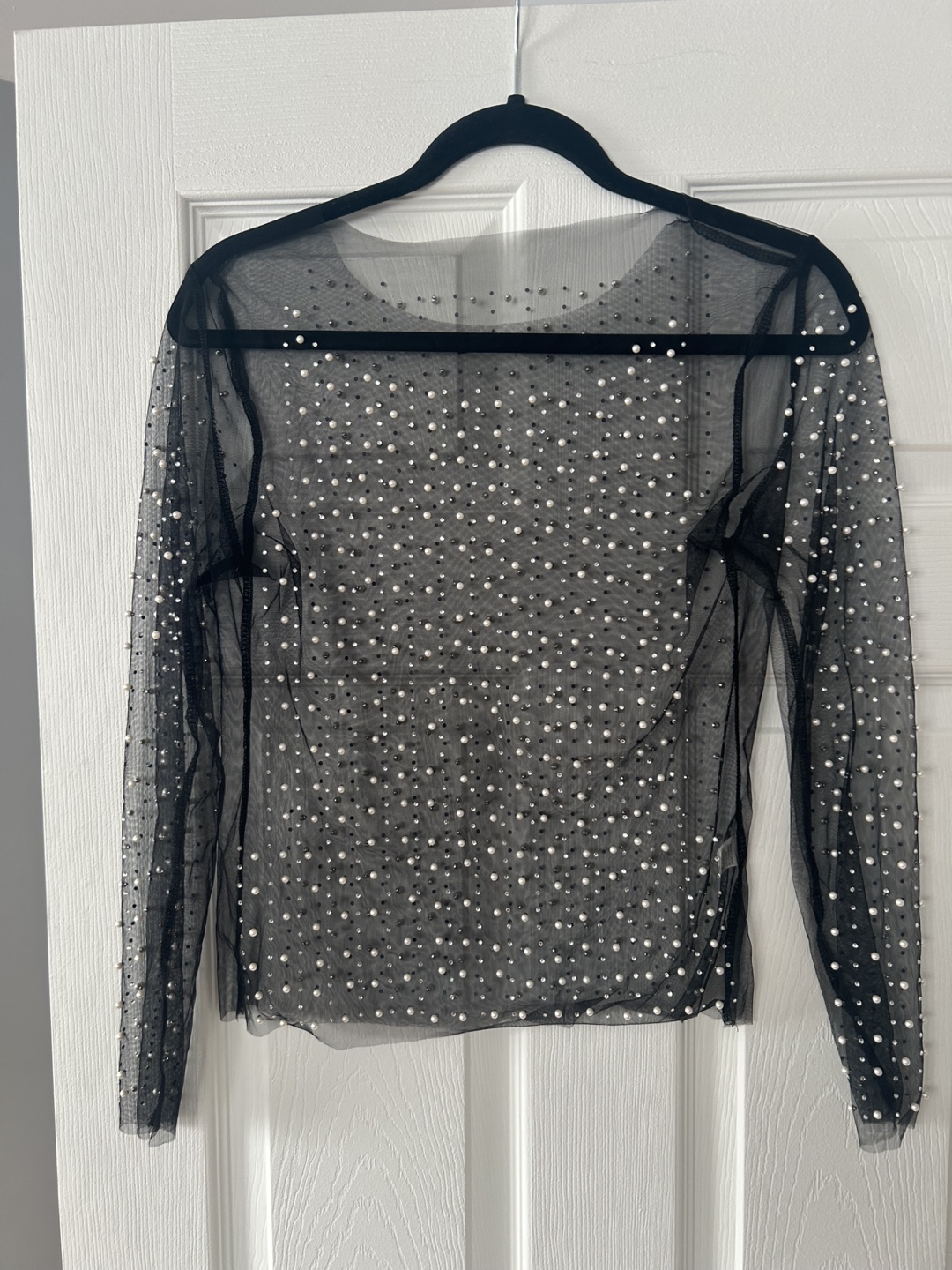 black mesh long-sleeve top. Covered in pearl and rhinestone embellishments. All intact. Great for concert or special occasion. Size small or children’s large