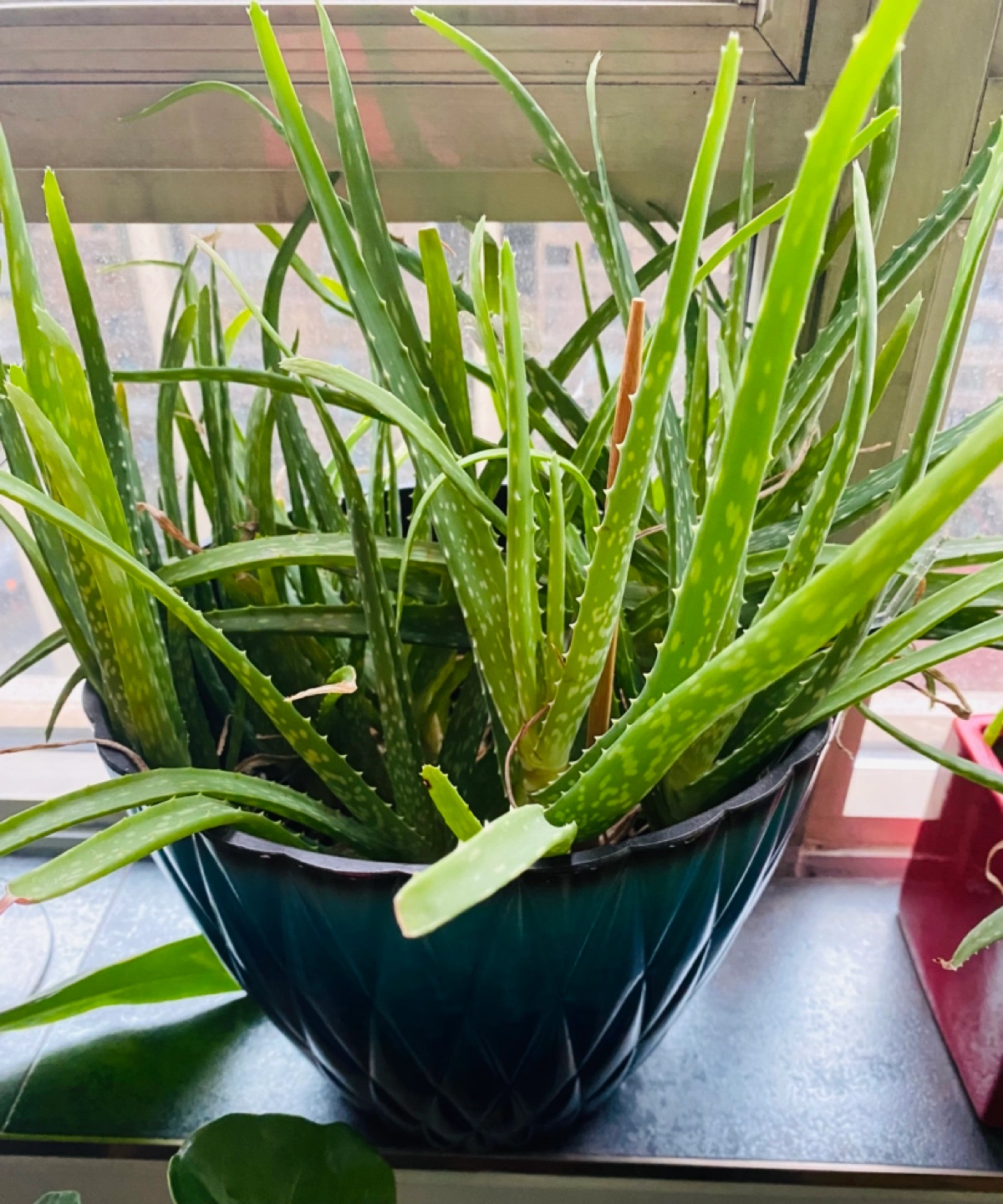 Healthy aloe vera plant, many leaves. Planted in a dark teal patterned pot. Growing every day!