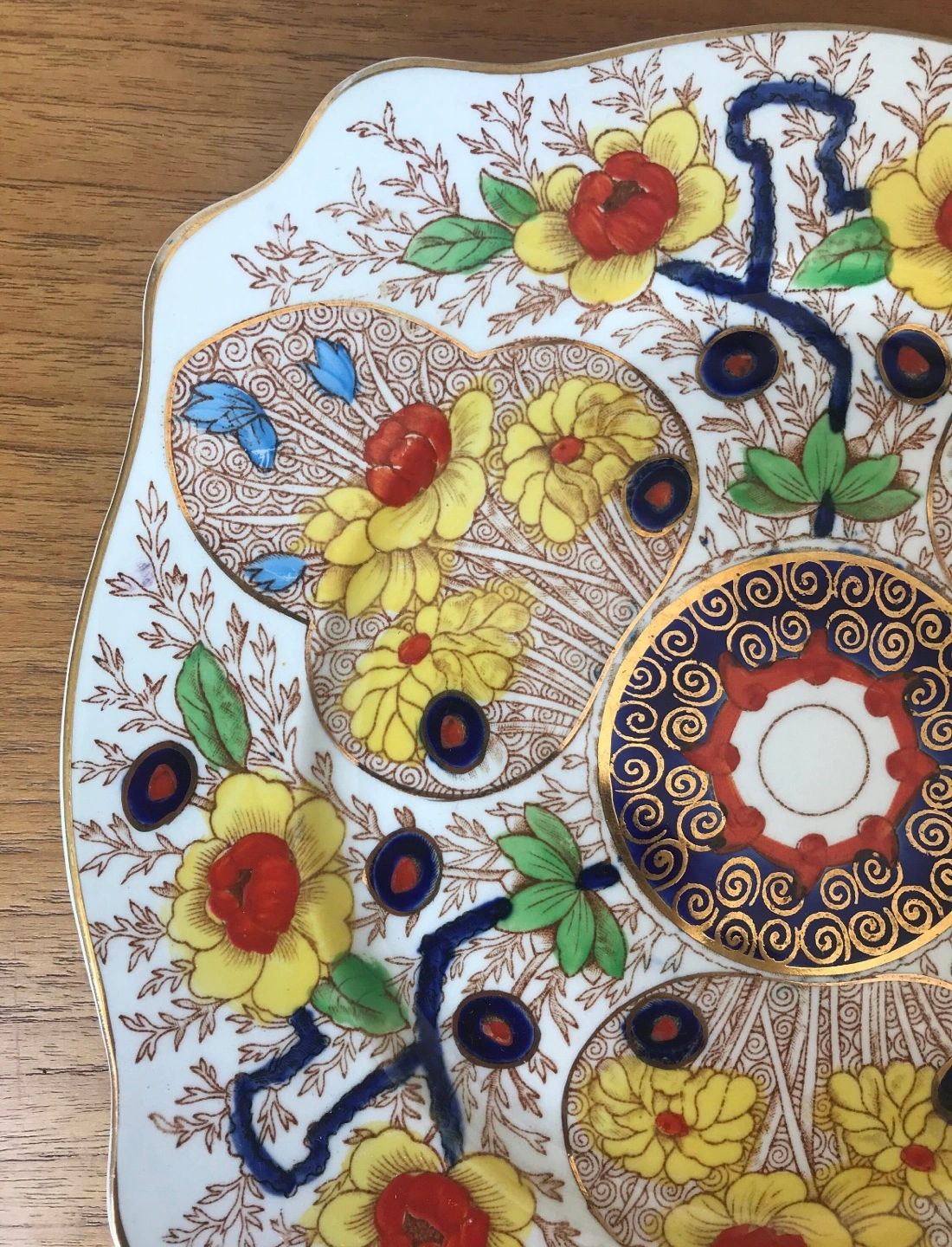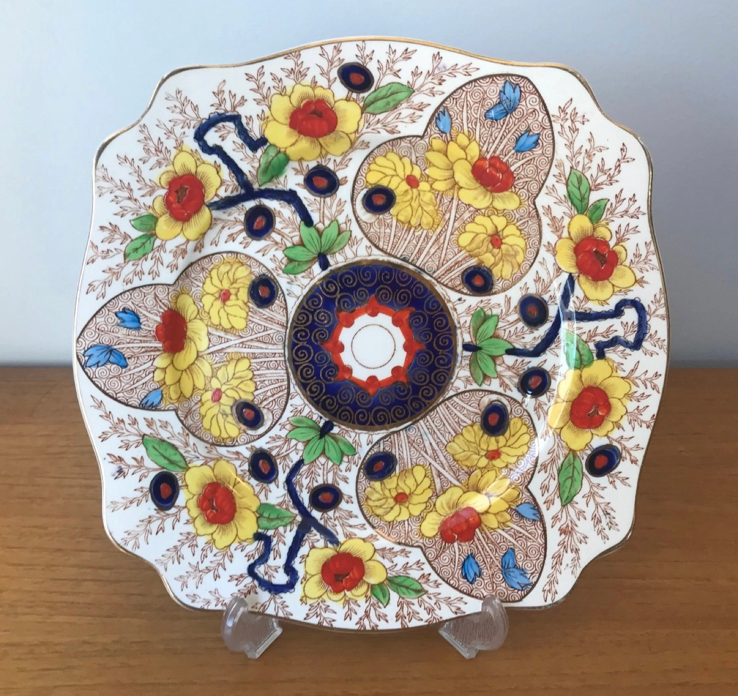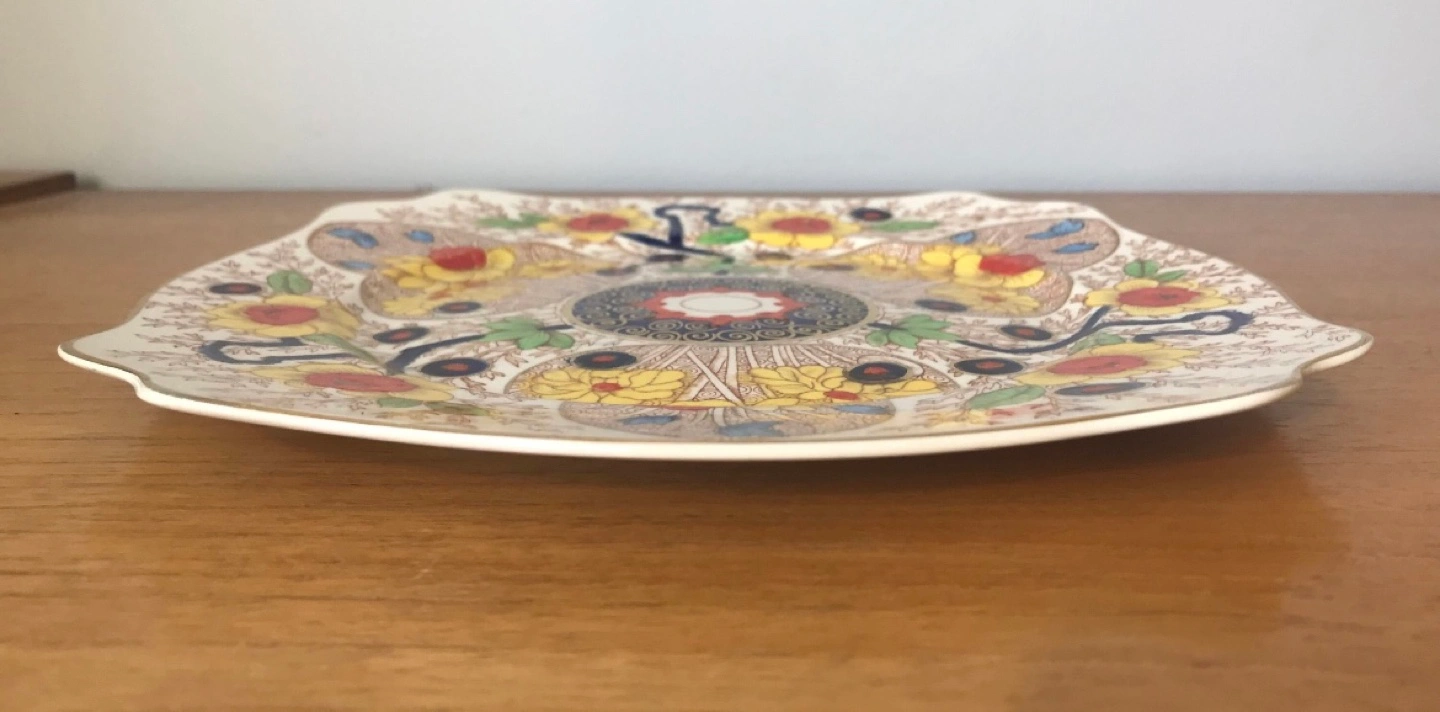 Ornate floral design. Square shape with scalloped edges. Gold accents. Beautiful colours. Collectible item.