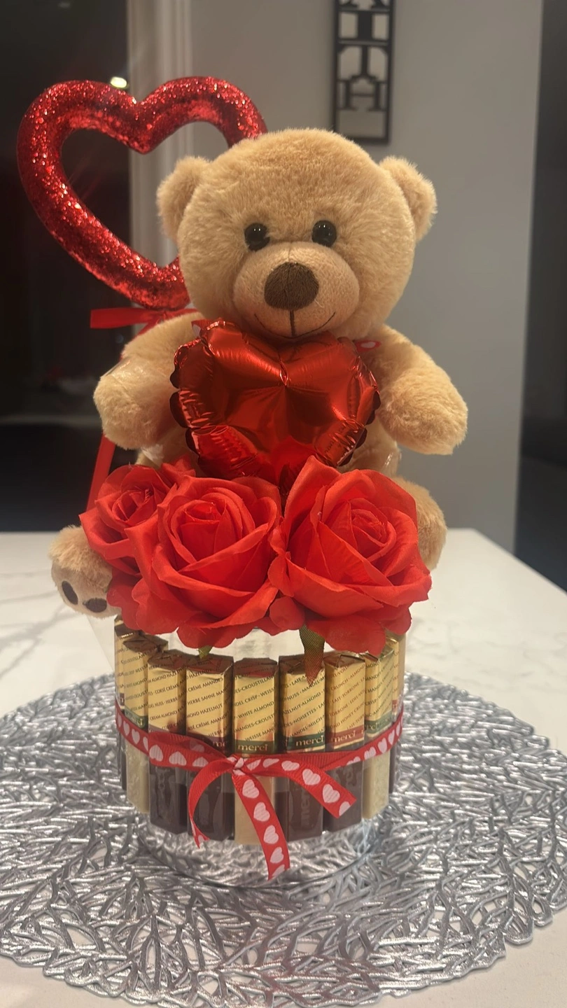 Adorable teddy bear arrangement. Features red roses, Ferrero Rocher chocolates, and a sparkly red heart. Perfect gift for Valentine's Day or any romantic occasion.
