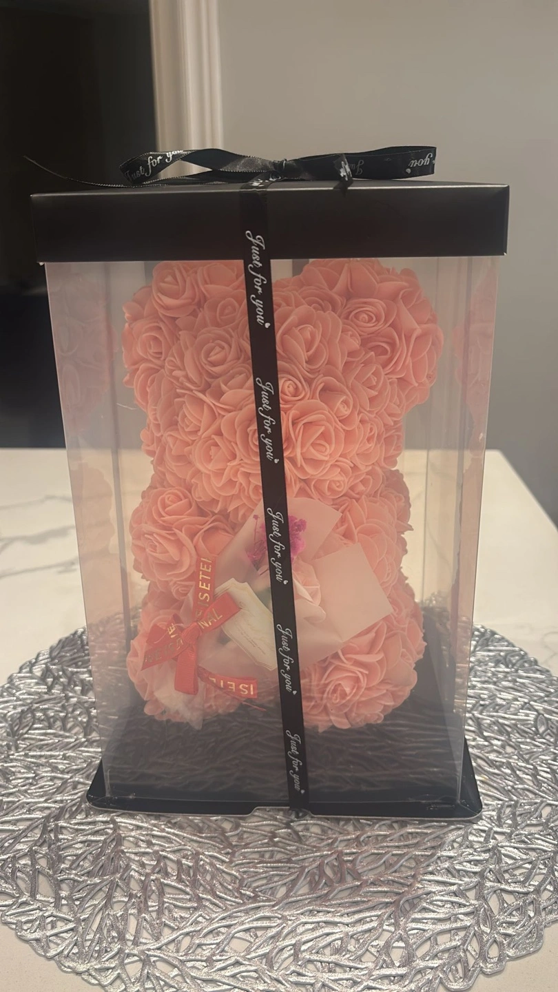 Adorable rose bear, light pink. Comes in a clear plastic box with a black lid. Black ribbon tied around the box. Small rose bouquet included.