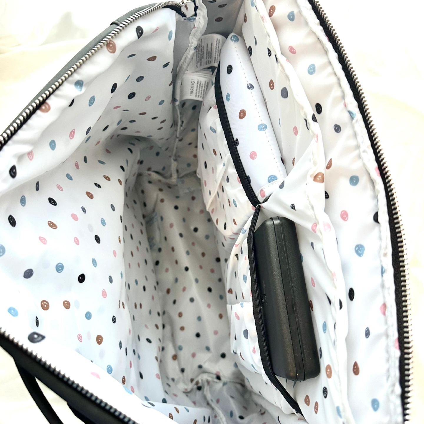Brand new, never been used, we bought this one and was gifted another. Convertible backpack. Multiple pockets and compartments. Includes changing pad. Water-resistant exterior and interior. Adjustable straps. Wear as backpack or shoulder bag.