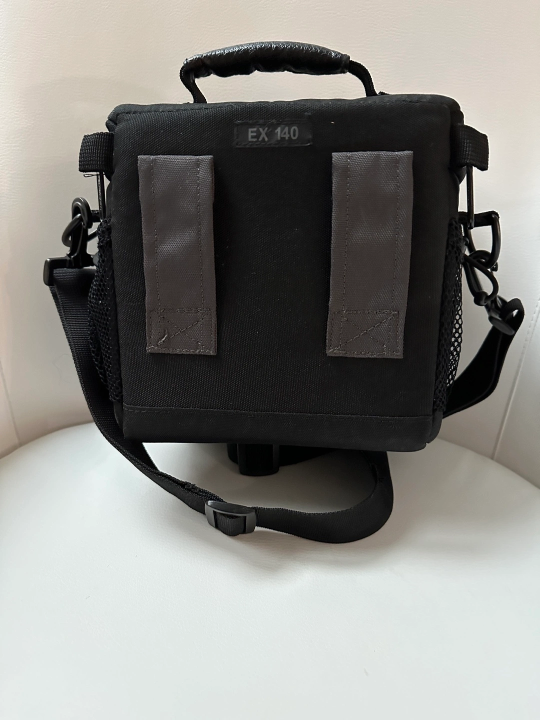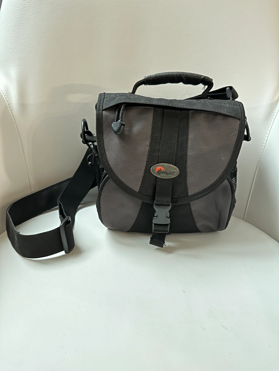 533Small camera bag. Grey and black. Adjustable shoulder strap. Multiple compartments. Good condition.