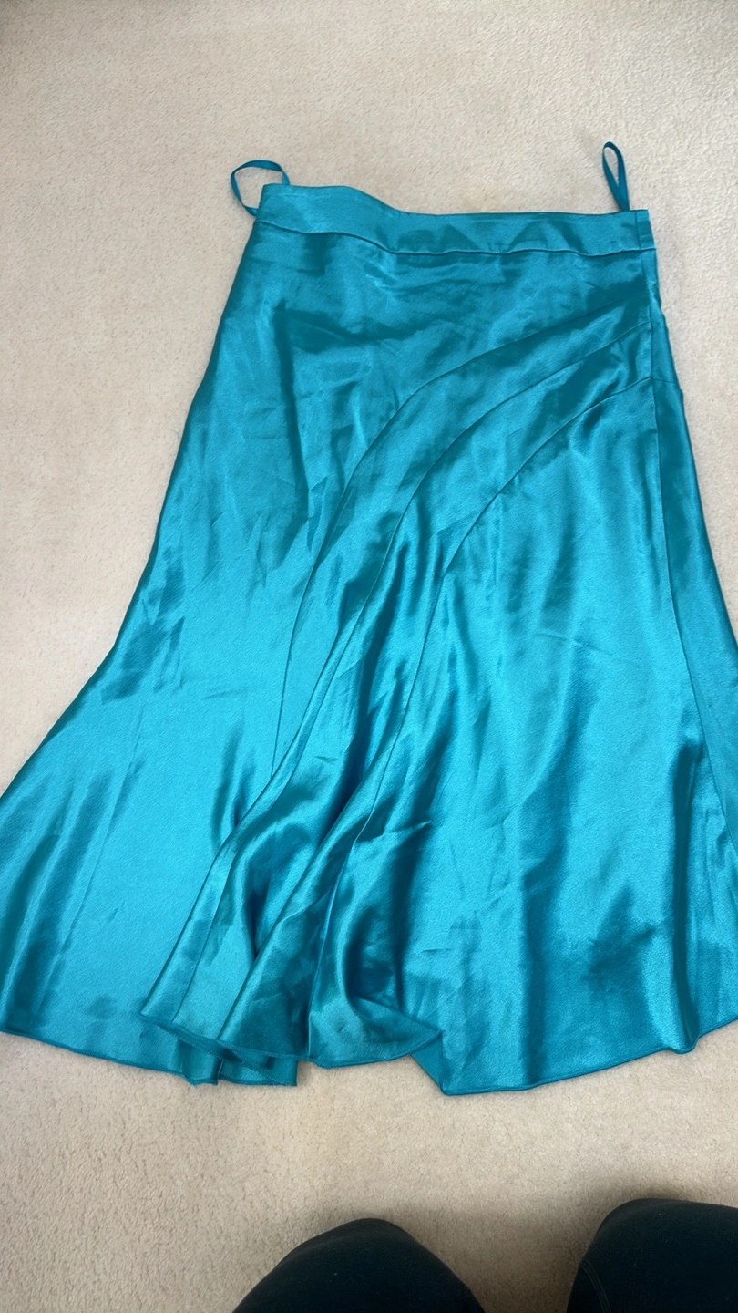 Beautiful teal satin midi skirt. A-line shape. Flowy fabric. Fully lined. Size small 3/4