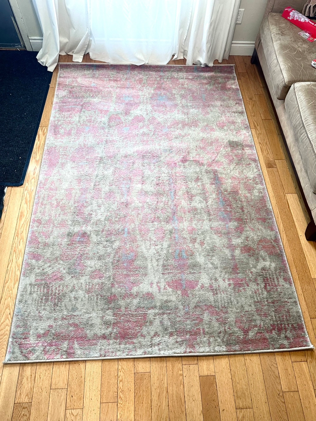 Large area rug. Pink, grey, and beige colour scheme. Machine washable. Measures 160x240 cm (5'3"x7'10"). Good condition.