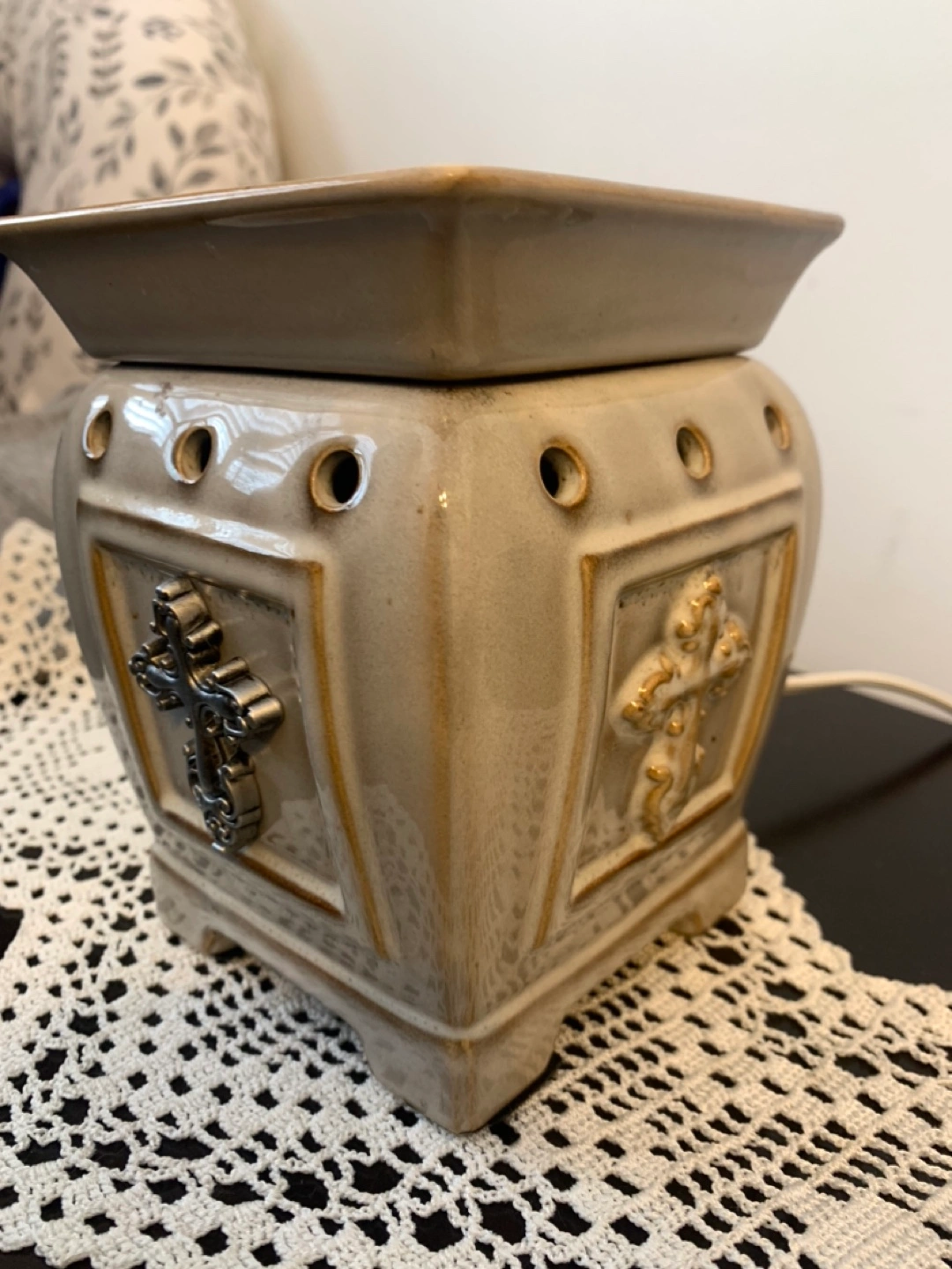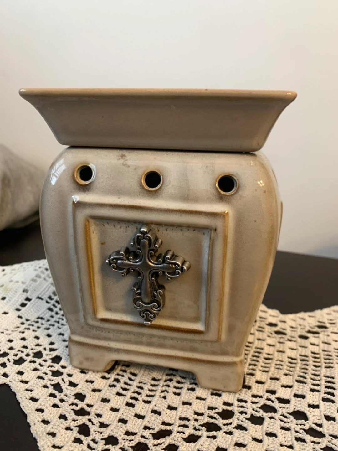 Beautiful ceramic wax warmer. Features a beige colour and ornate cross accents. Perfect for adding fragrance to your home. Pre-owned.