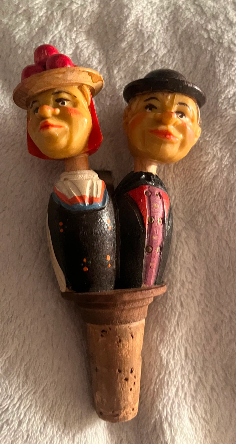 Cute vintage wine bottle stopper. Features a carved wooden couple. Woman carries a basket of apples. Unique and quirky.