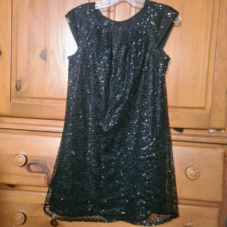Black sequined mini dress. Size small. Short sleeves. Round neckline. Keyhole back.