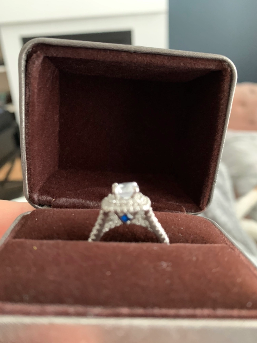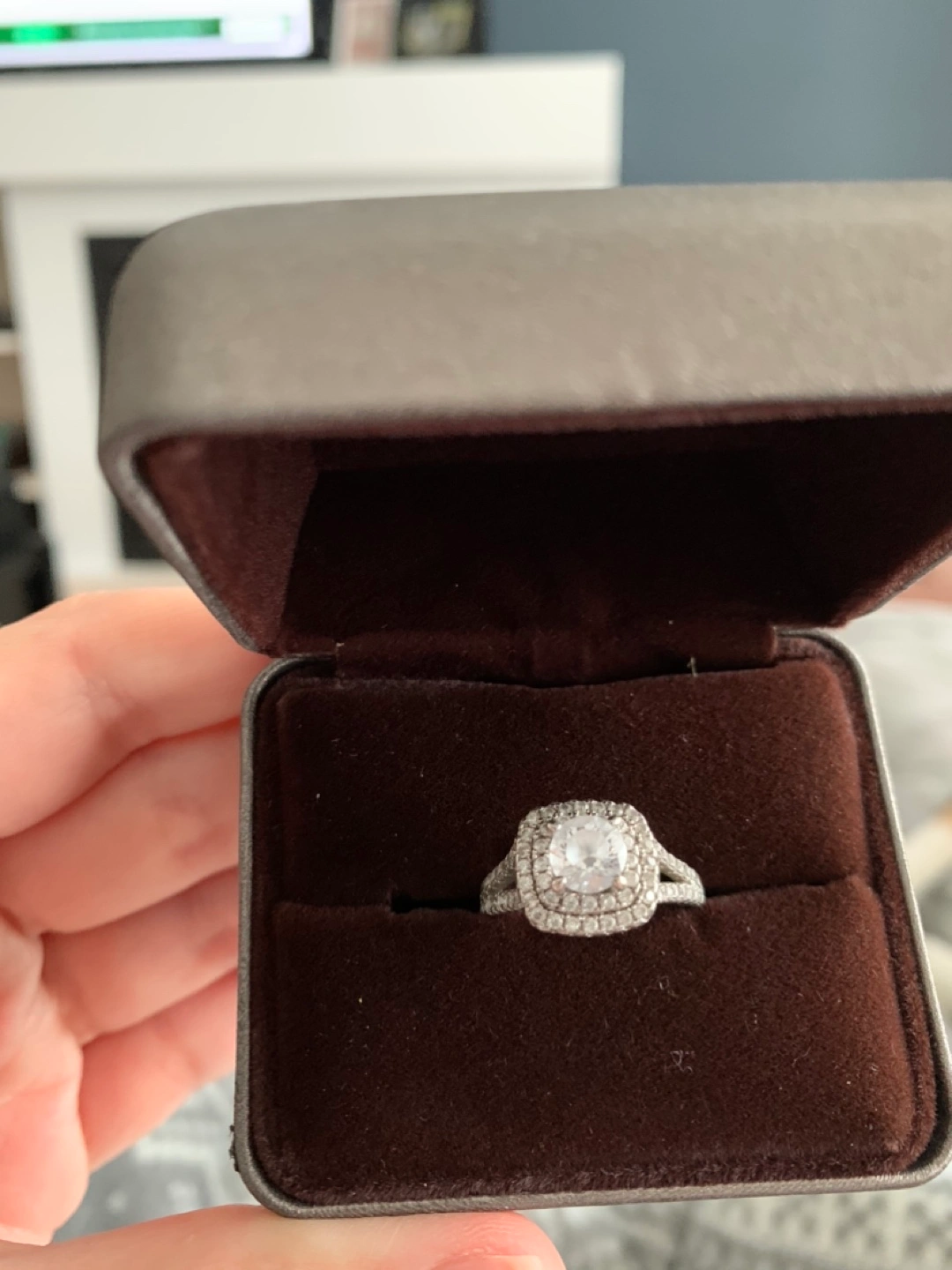 Beautiful cushion-cut centre stone. Double halo split shank of sparkling crystal. 925 Silver band. Has 2 sapphires on each side. Comes in original box. Great replica of the Vera Wang Love collection engagement ring.