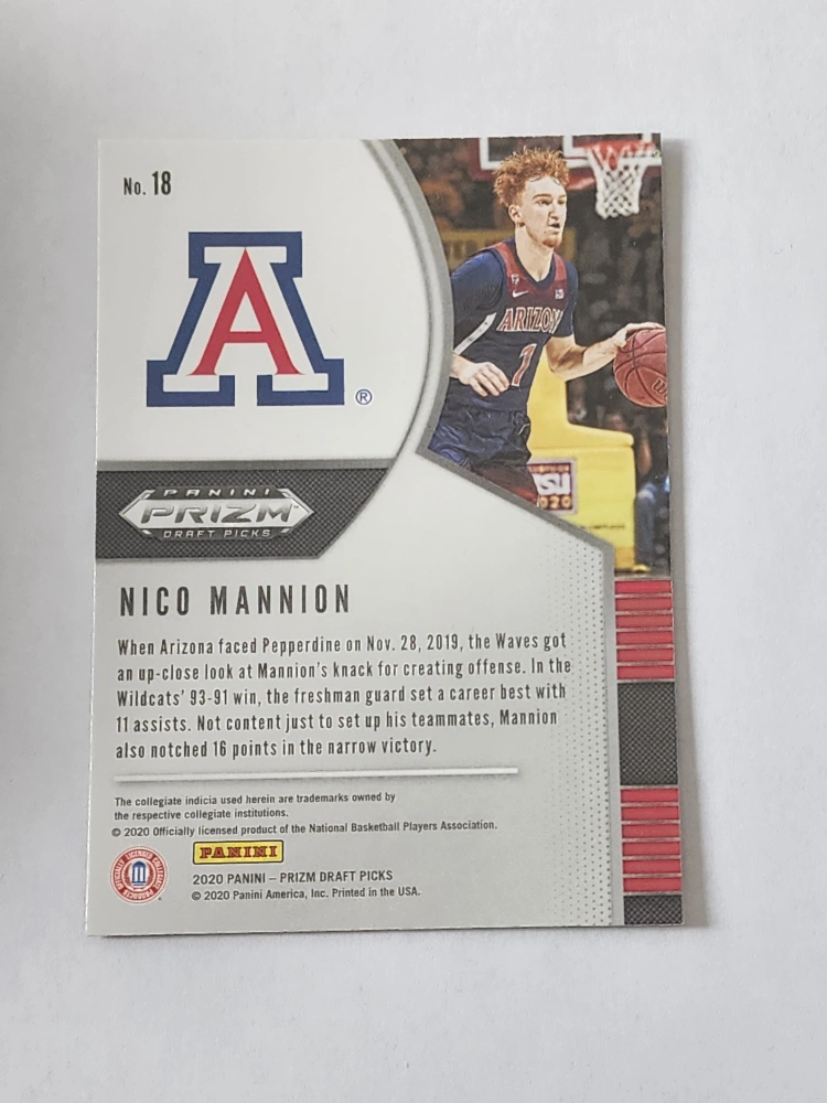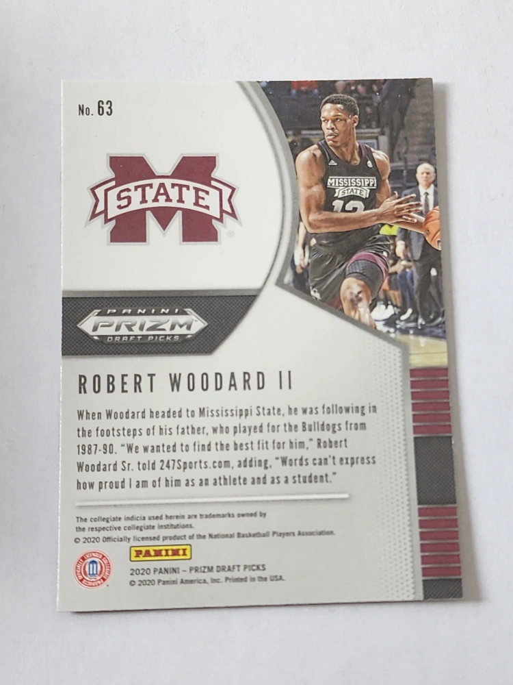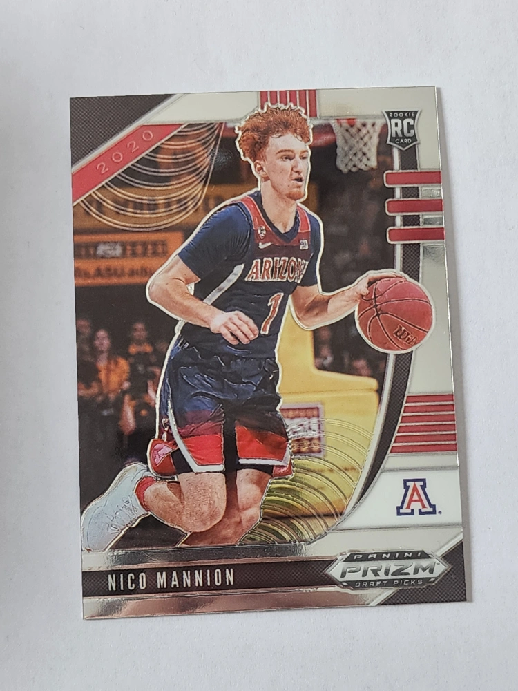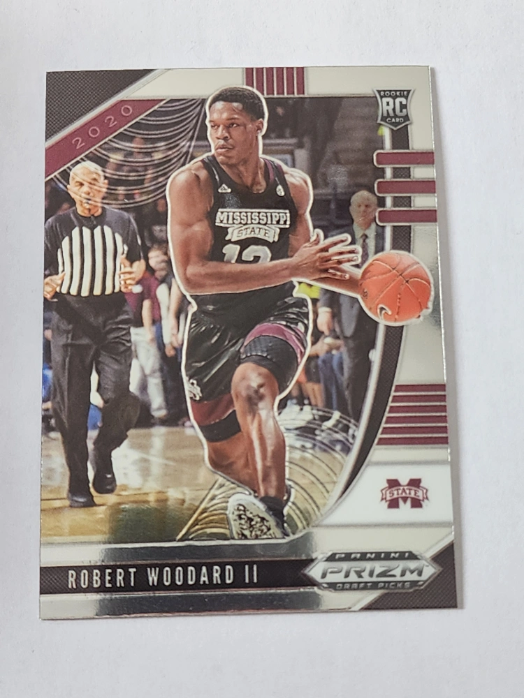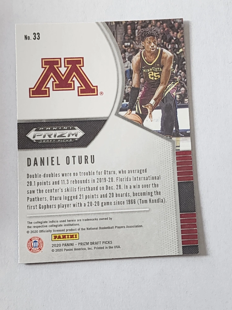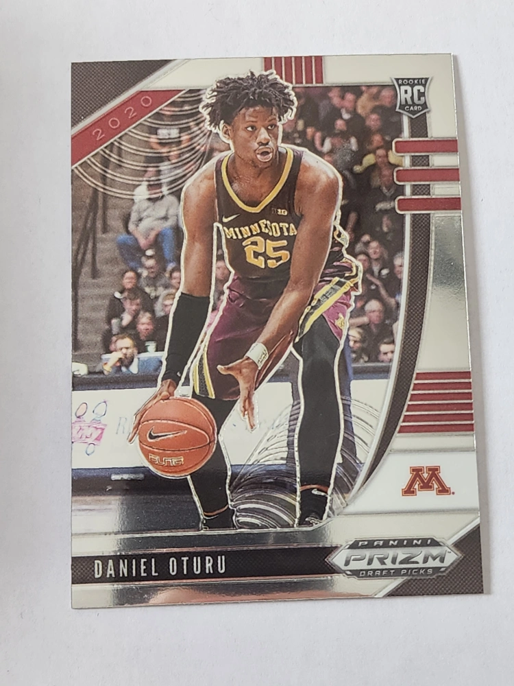 Five 2020 Panini Prizm Draft Picks basketball cards. Includes Daniel Oturu, Robert Woodard II, and Nico Mannion rookie cards. Collectible cards featuring college basketball players.