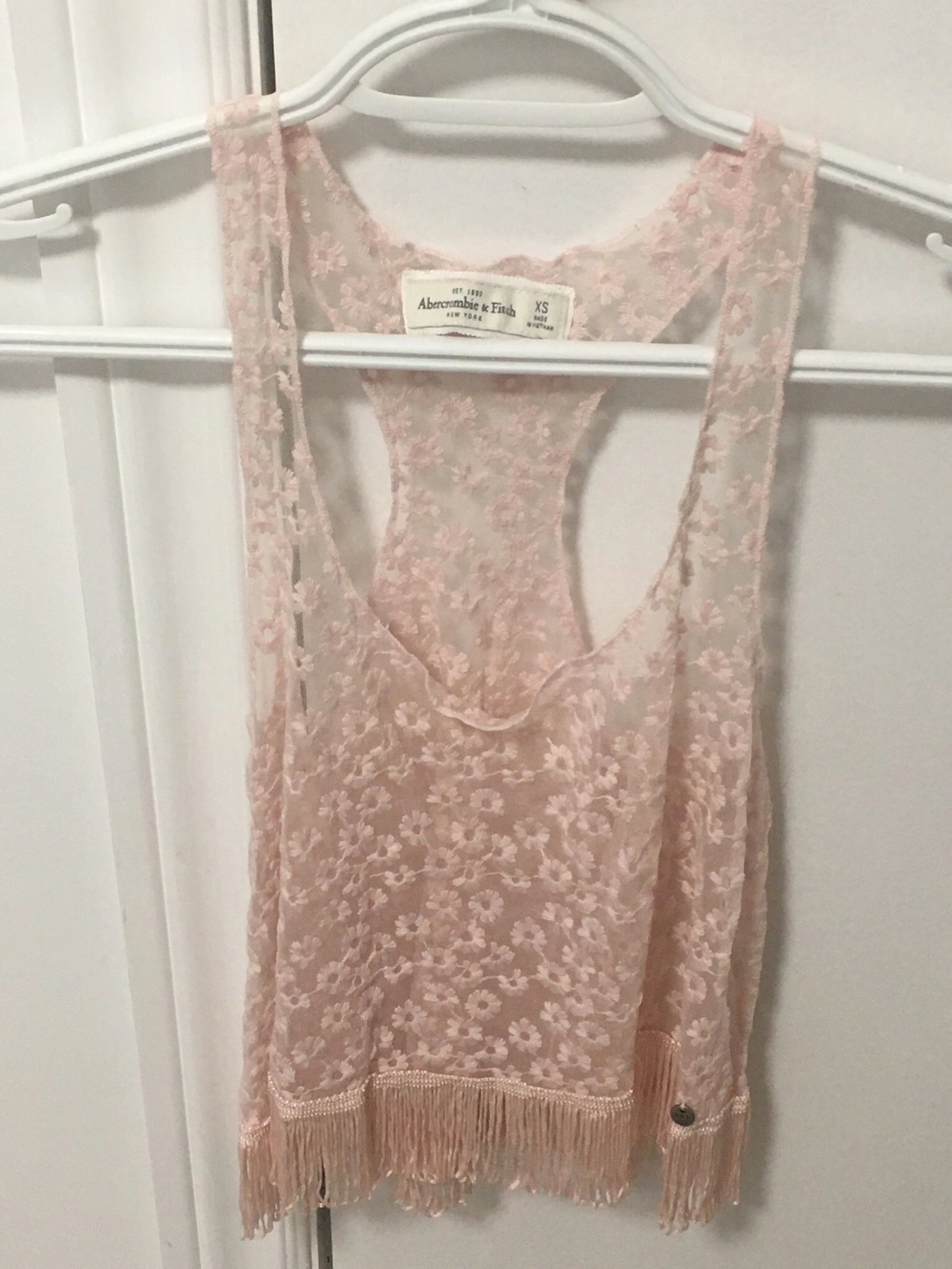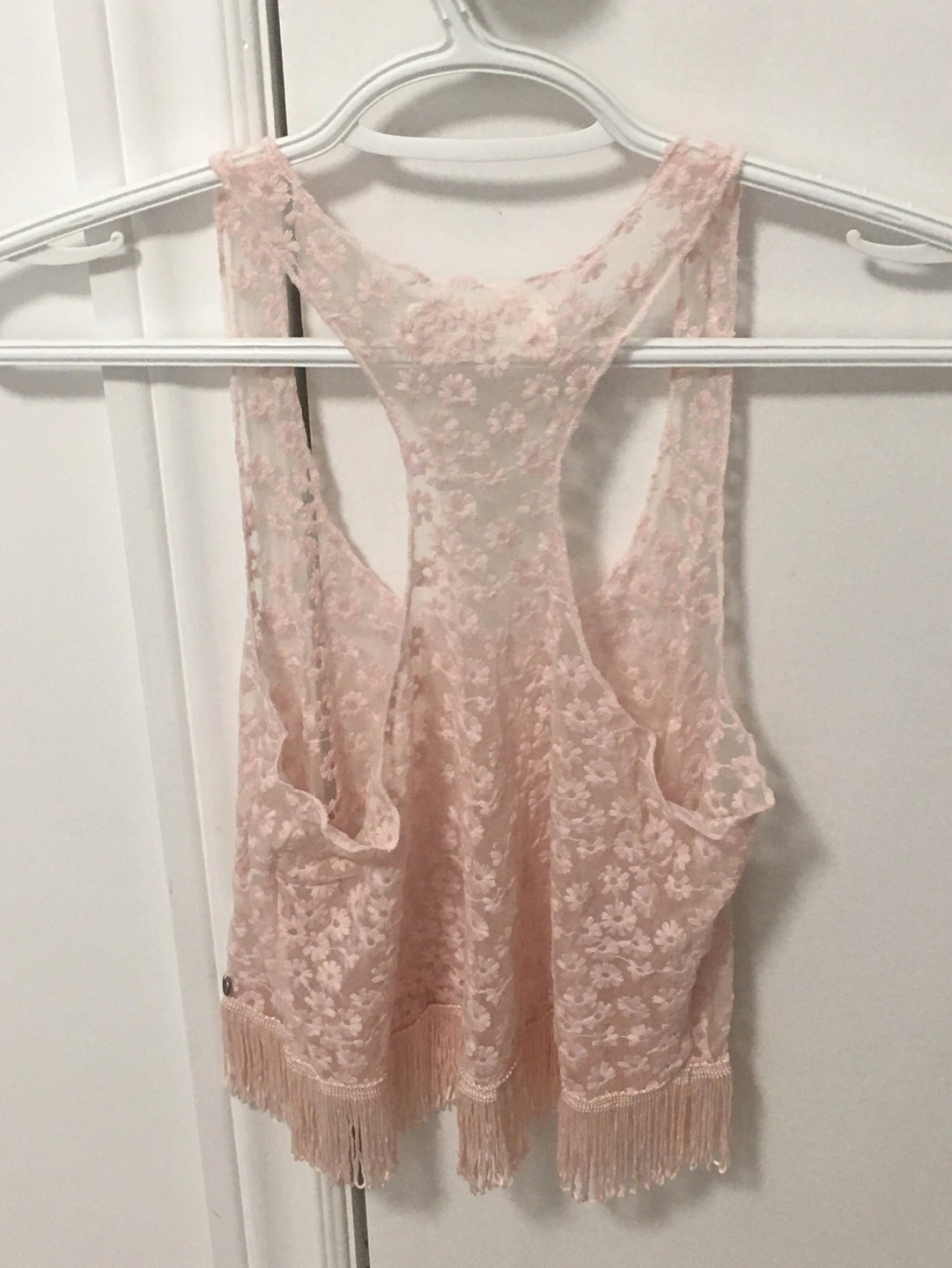 147Adorable pink lace tank top. Features a racerback design and a fringed hem. Size extra small. Preowned and in excellent condition, very cute to match with your event/ outings!
