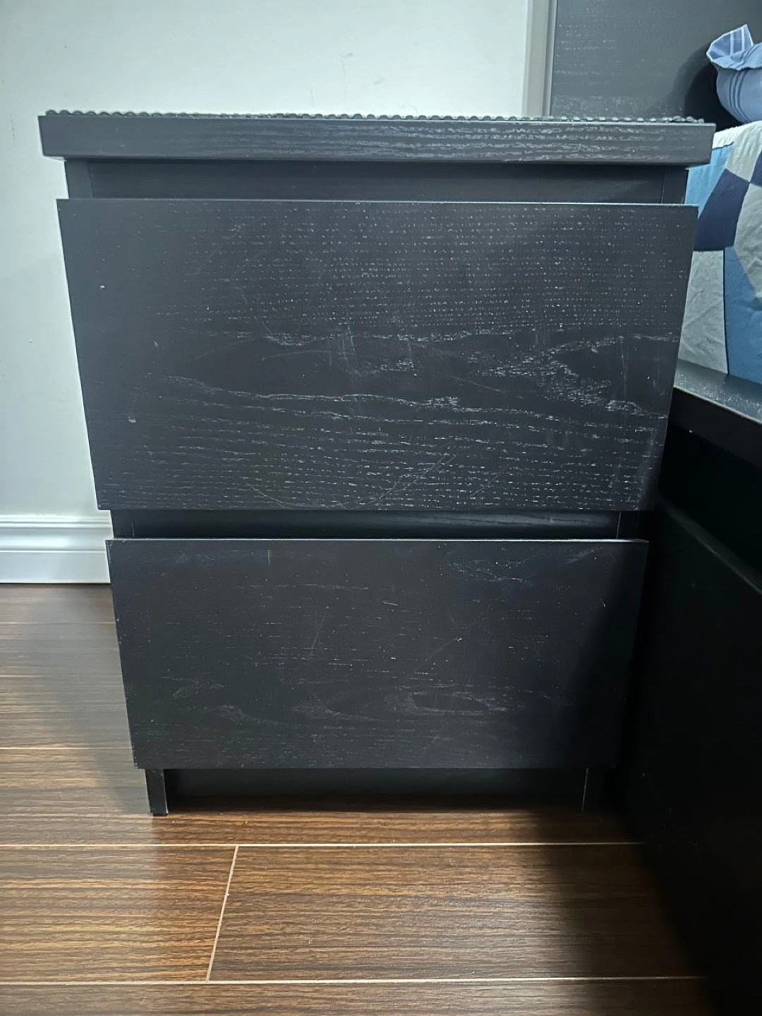 Black-brown two-drawer nightstand. No stains or scratches at all. Just 4 months old. Minimum usage. Retail at 79$ plus taxes from Ikea.