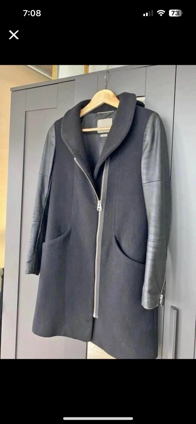 Black coat with leather sleeves, zipper closure, pockets.