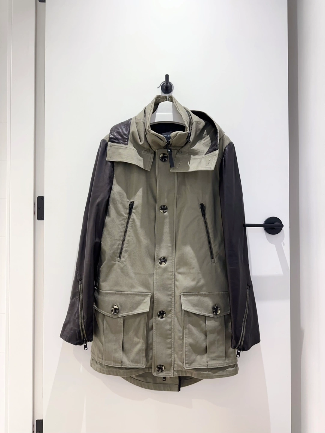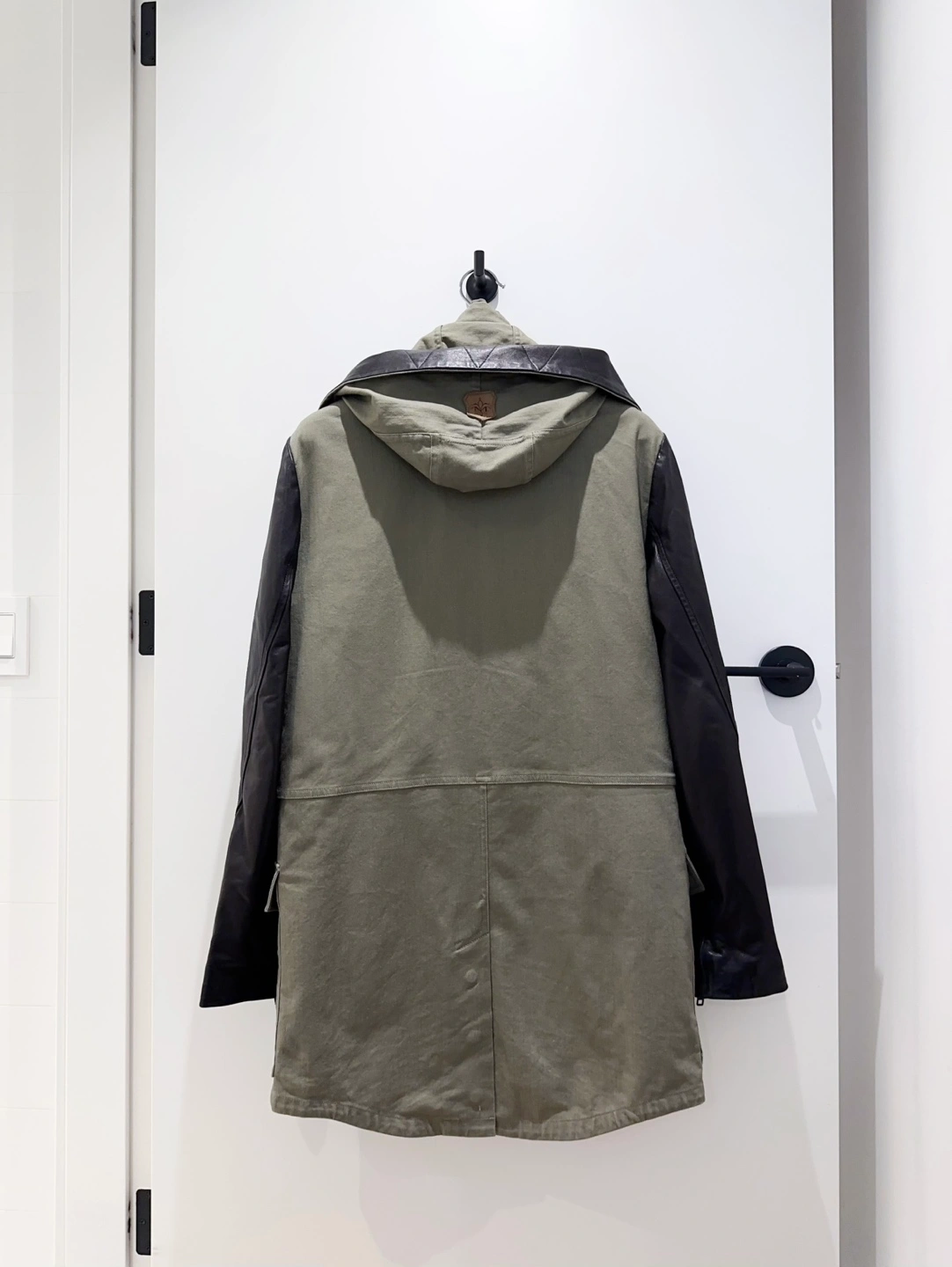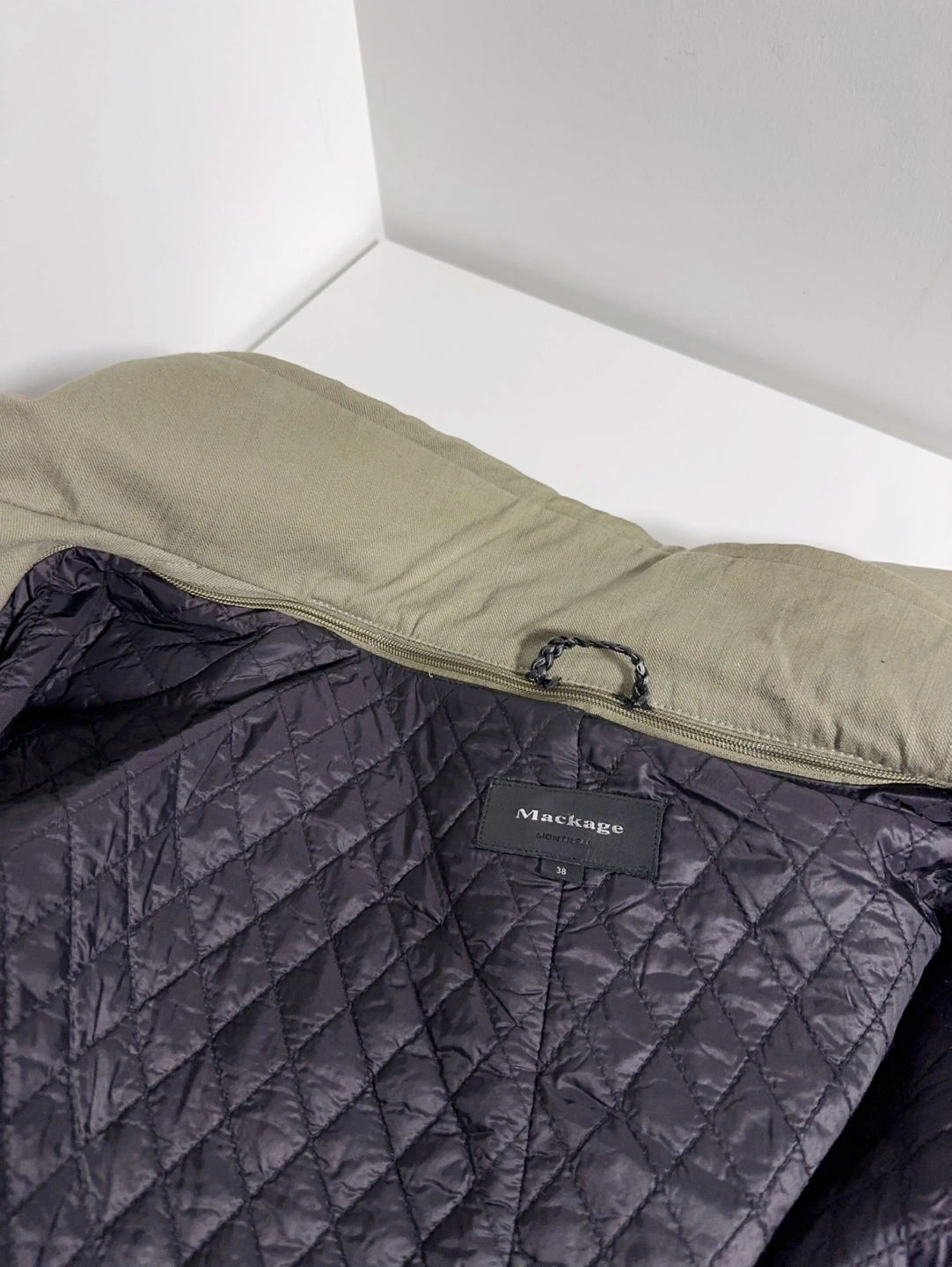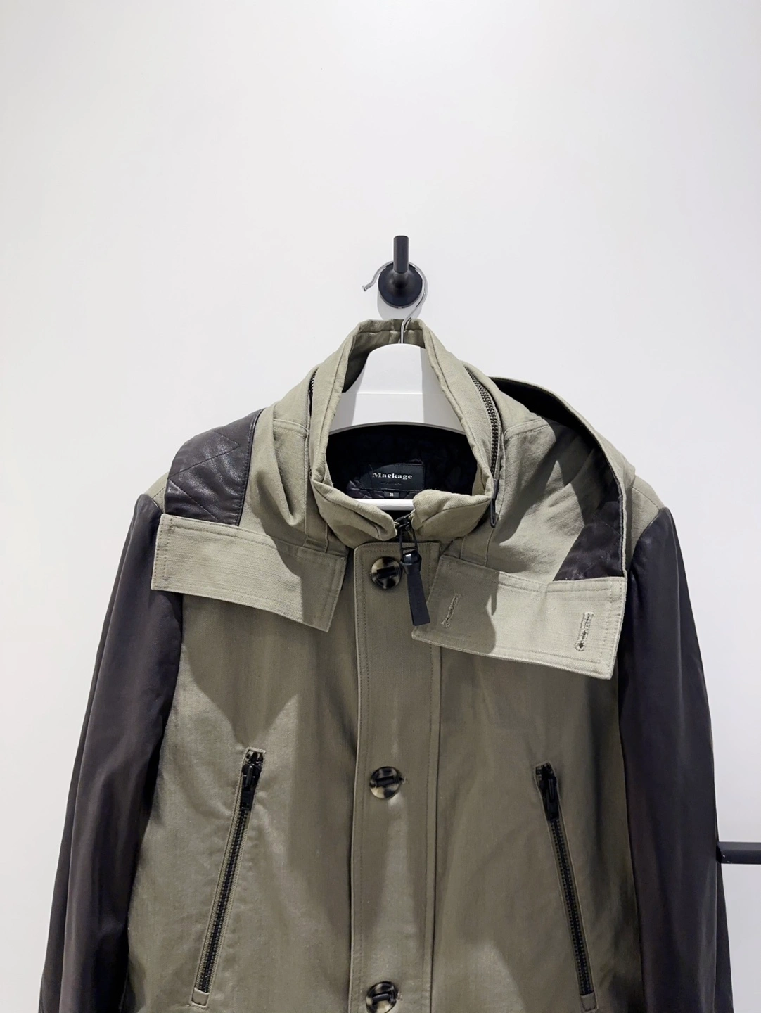 277Stylish Mackage parka. Features military green canvas body, black lamb leather sleeves, and a removable hood. Multiple pockets. Zipper and button closure. The lining is removable for extra warm, or suitable for spring/ fall. The coat is in excellent condition. I’m just clearing out my closet. I’m normally a size small or medium in most brands, depending on the fit.
