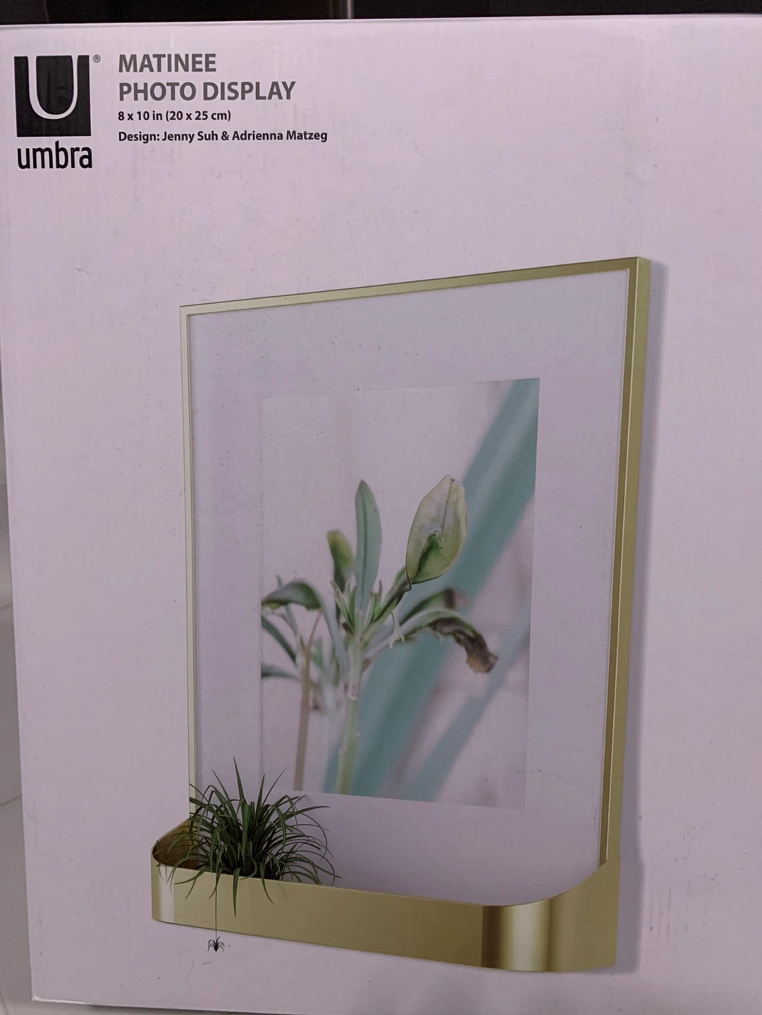 Brand new in box. Gold-coloured metal frame. Small shelf at bottom. Holds 8 x 10 inch photos. Designed by Jenny Suh & Adriana Mattez.