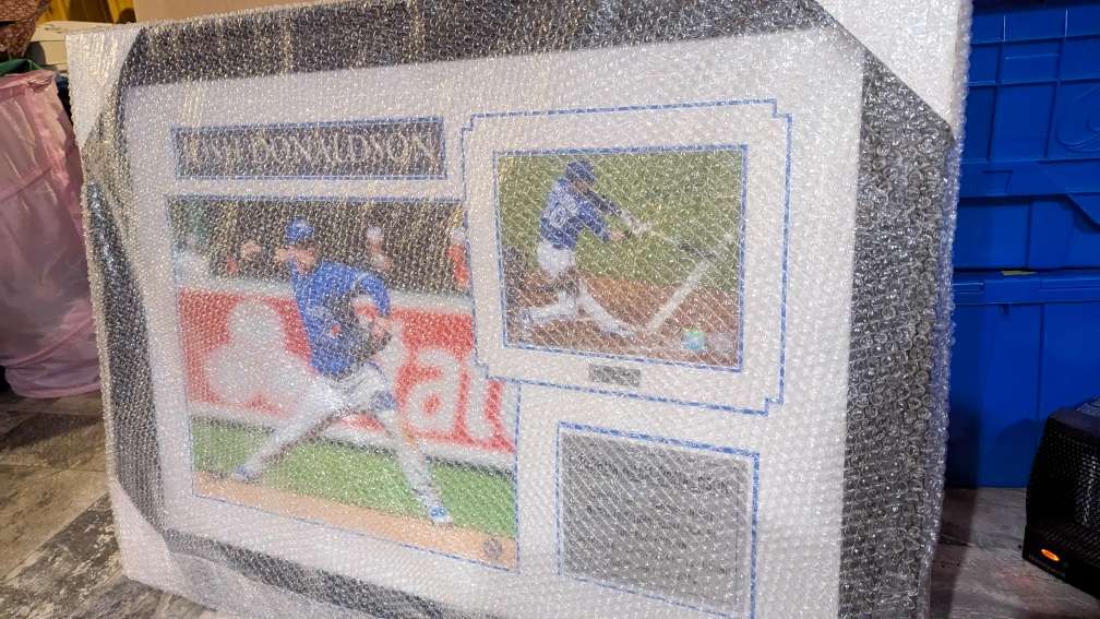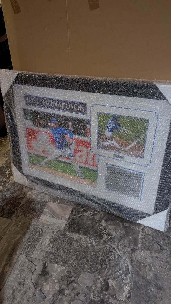 Large 40" x 28" framed photo collage. Features multiple action shots of Josh Donaldson. Black frame. Bubble wrap protection. Limited edition 27/100