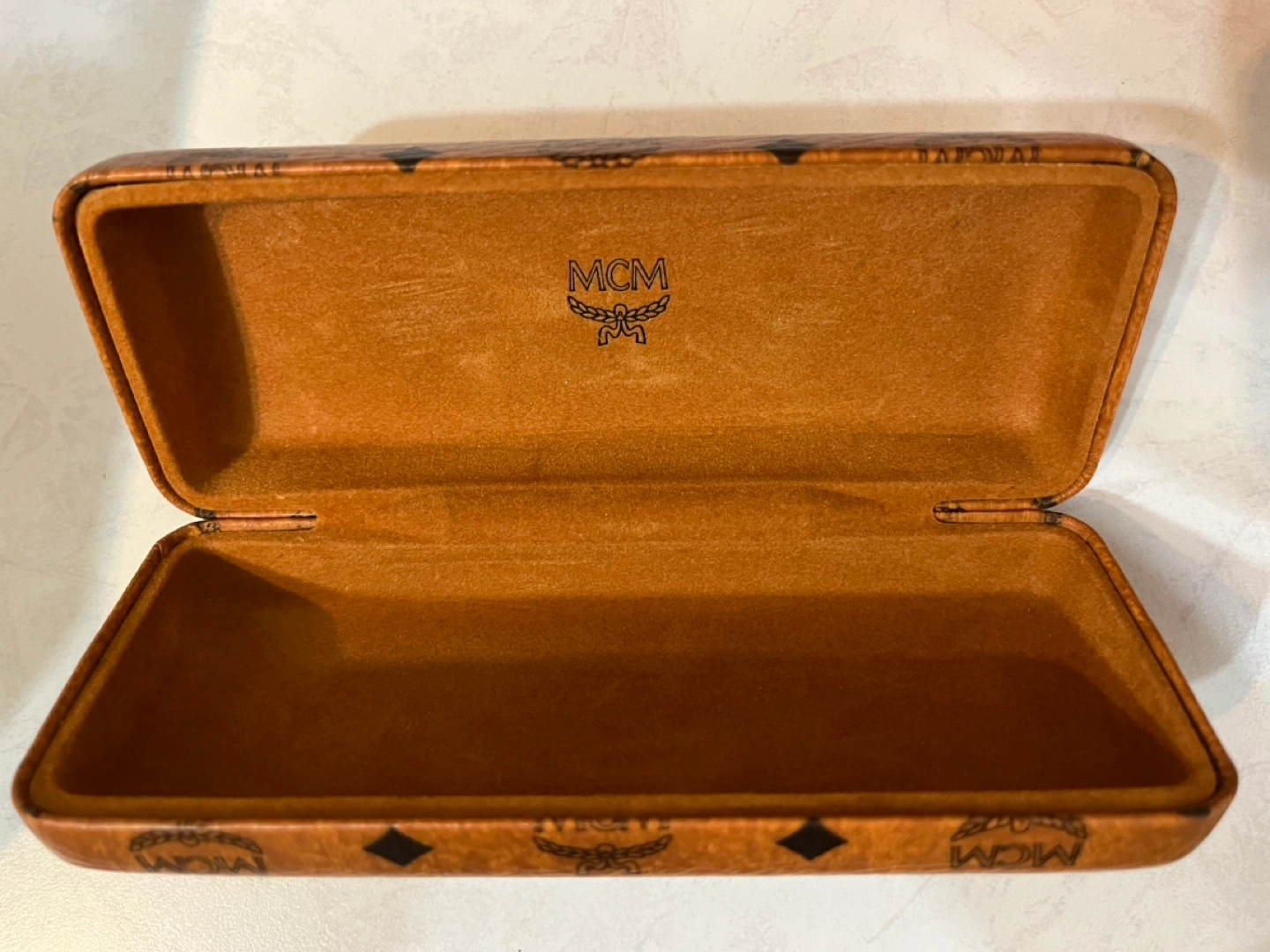32Brown leather-like MCM sunglasses case. Classic MCM logo. Hard case. Interior is brown suede-like material. Good condition.