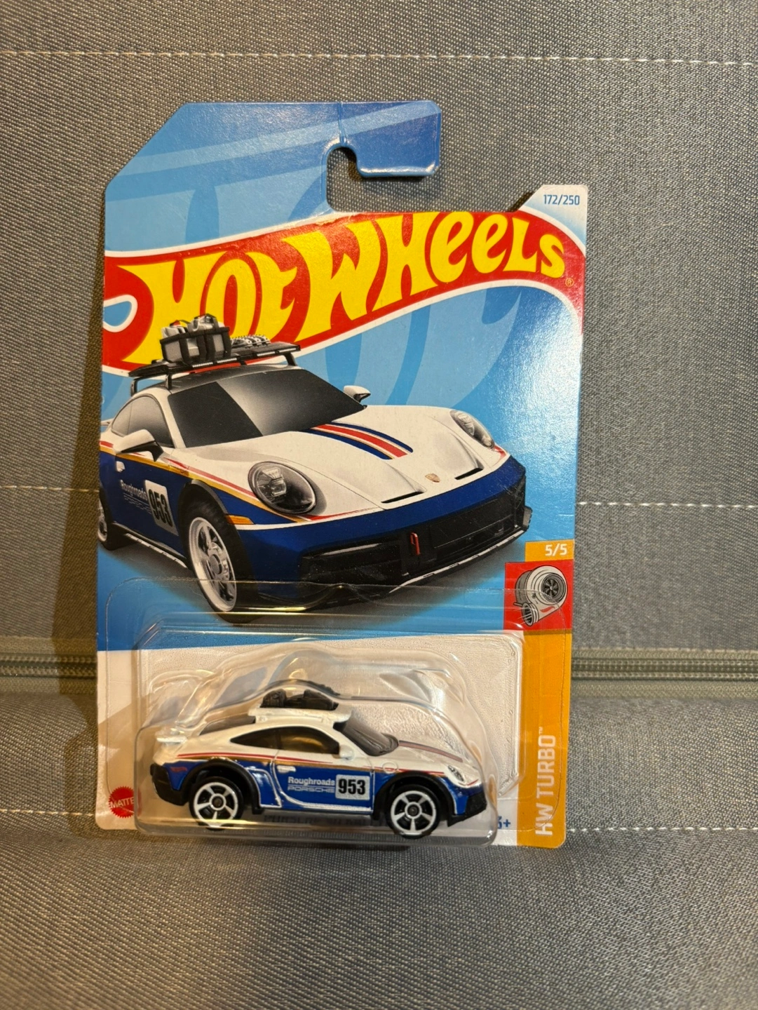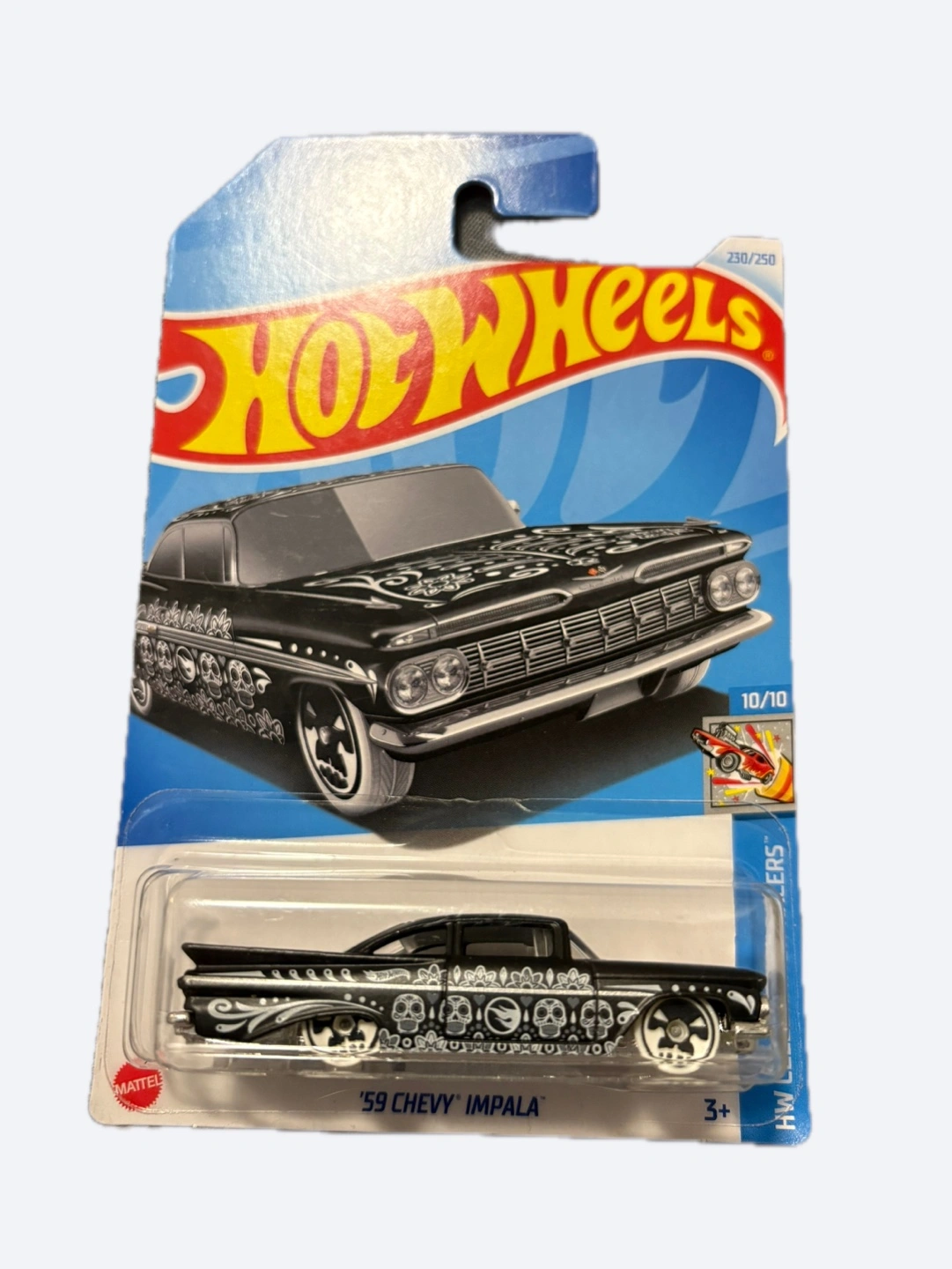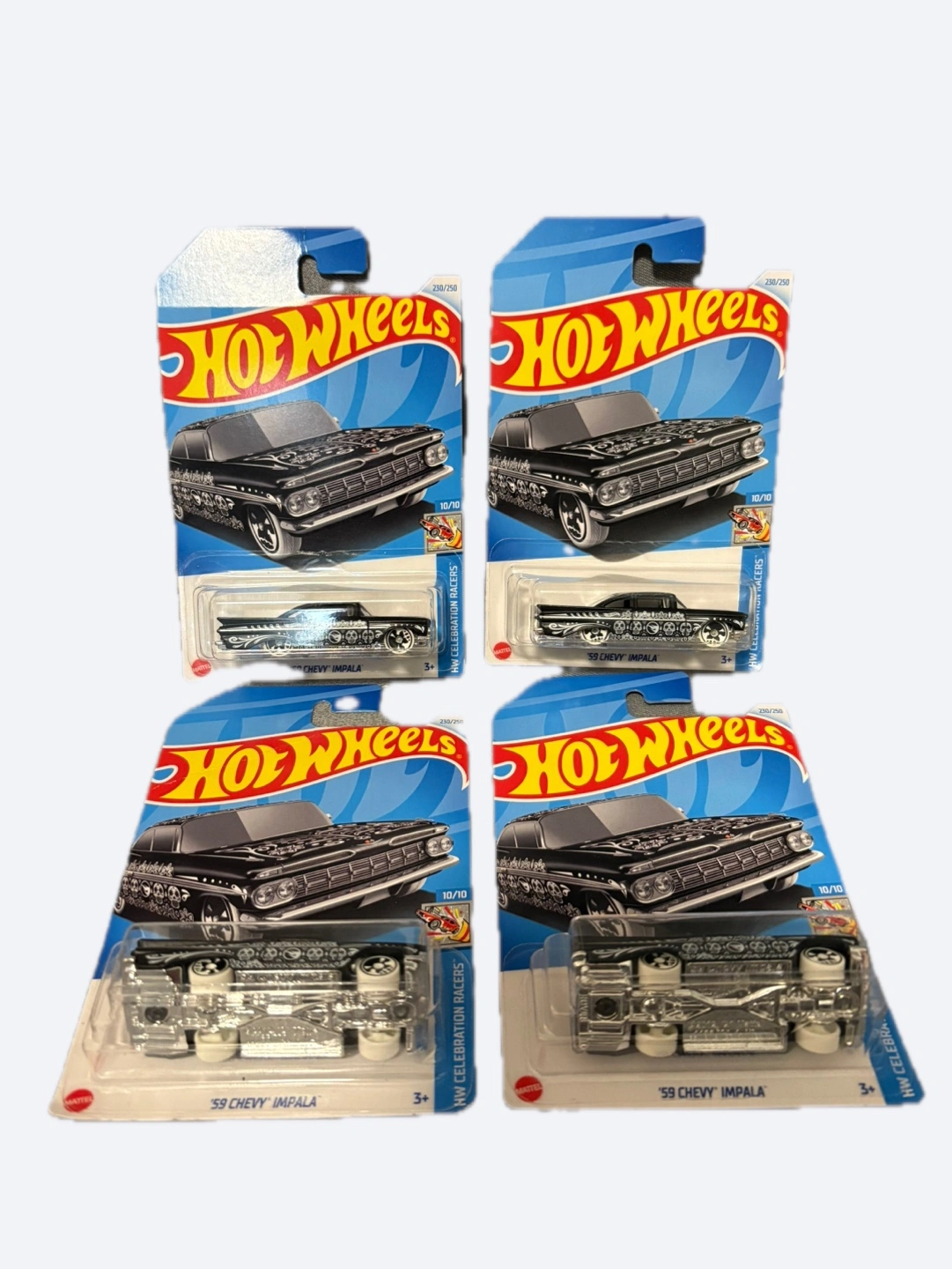 Five Hot Wheels cars. Includes Porsche 911, '59 Chevy Impala (x4), and Nissan GT-R. All in original packaging. Various colours and designs. Great for collectors.