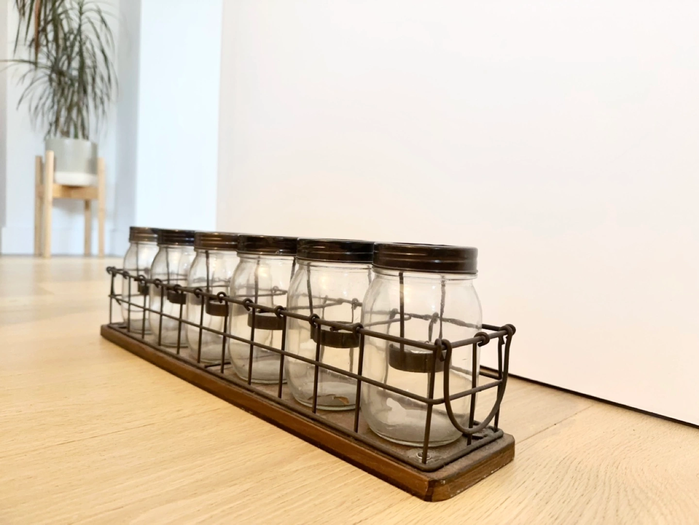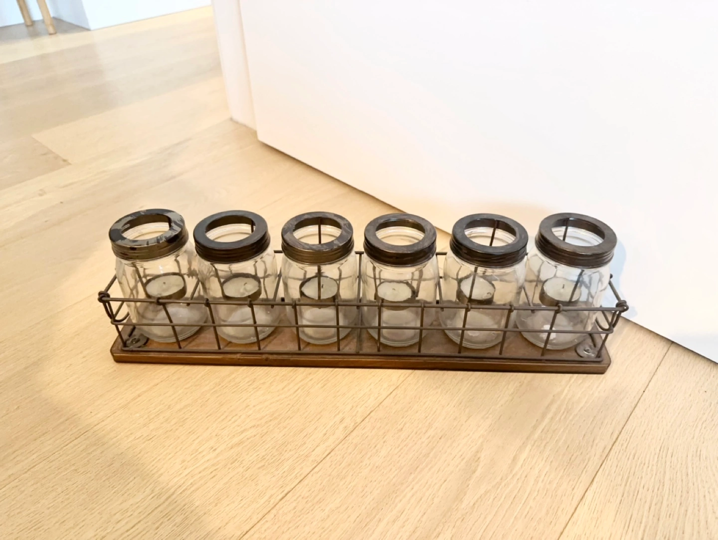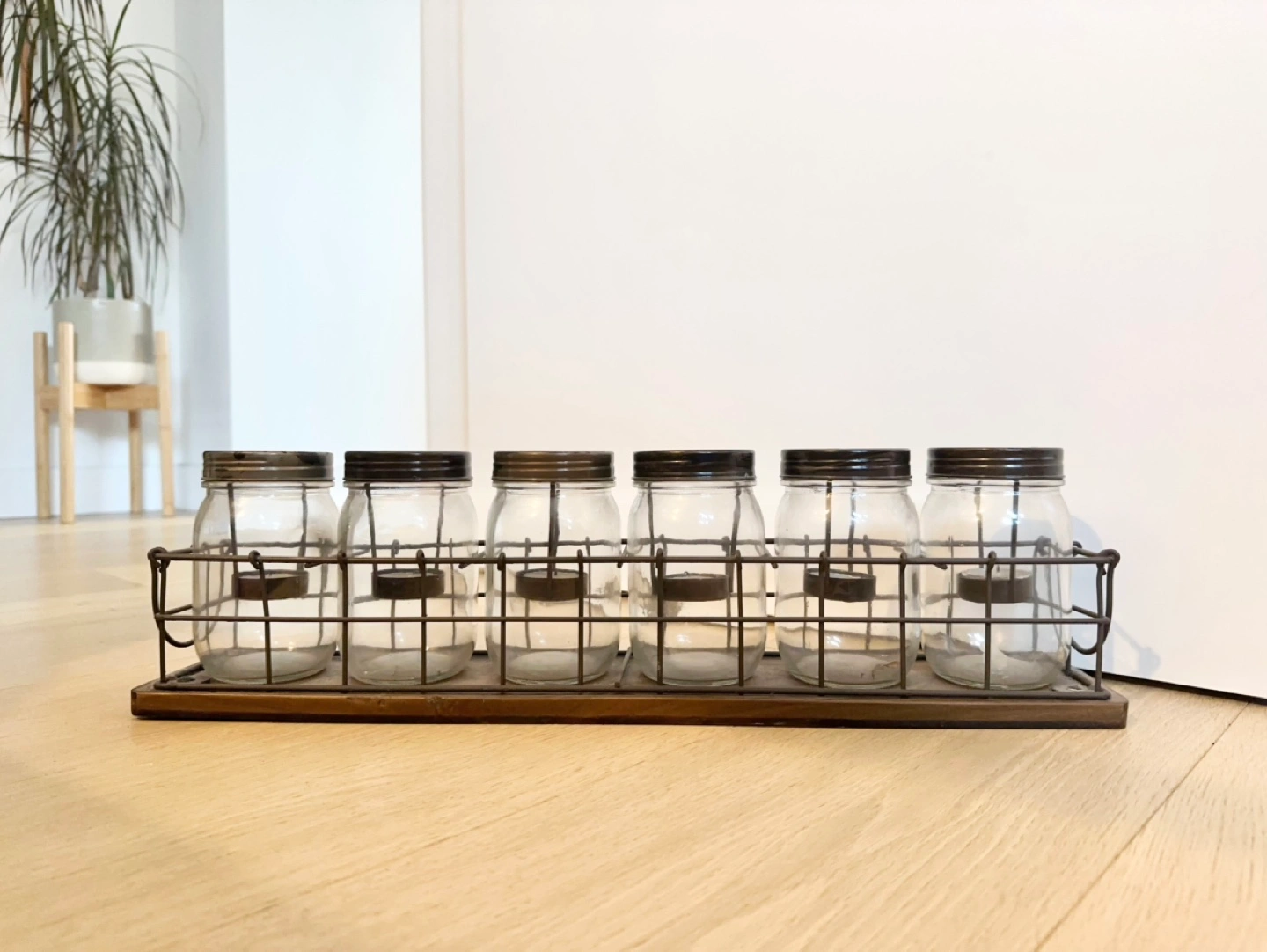 Six glass jars with metal lids in a wooden and wire rack. Perfect for tea lights or small candles. Adds rustic charm to any space.