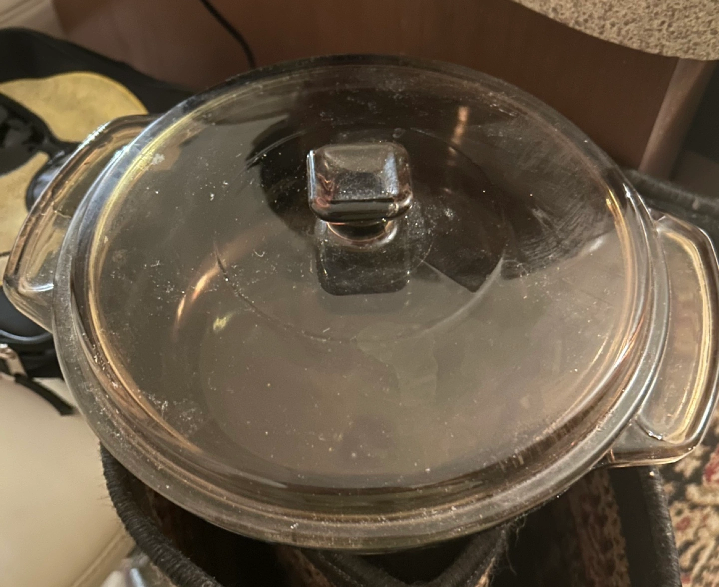 257glass casserole dish. Features a glass lid with a knob. It goes in the oven.