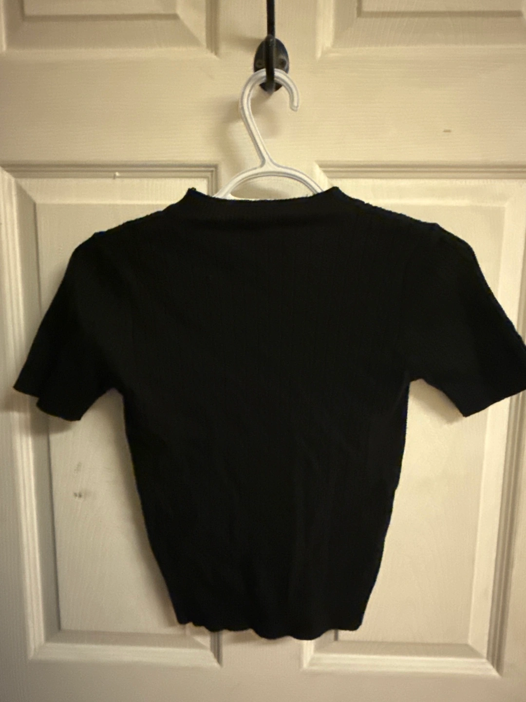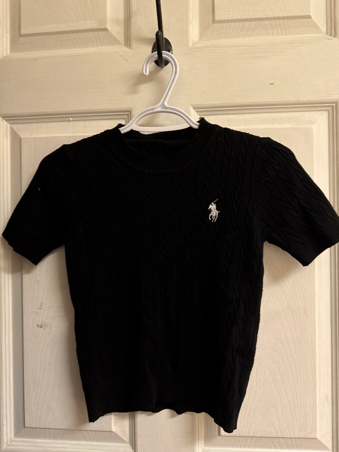 Black short sleeve knit top. Cable knit texture. Polo Ralph Lauren logo embroidered on the chest. Small size.