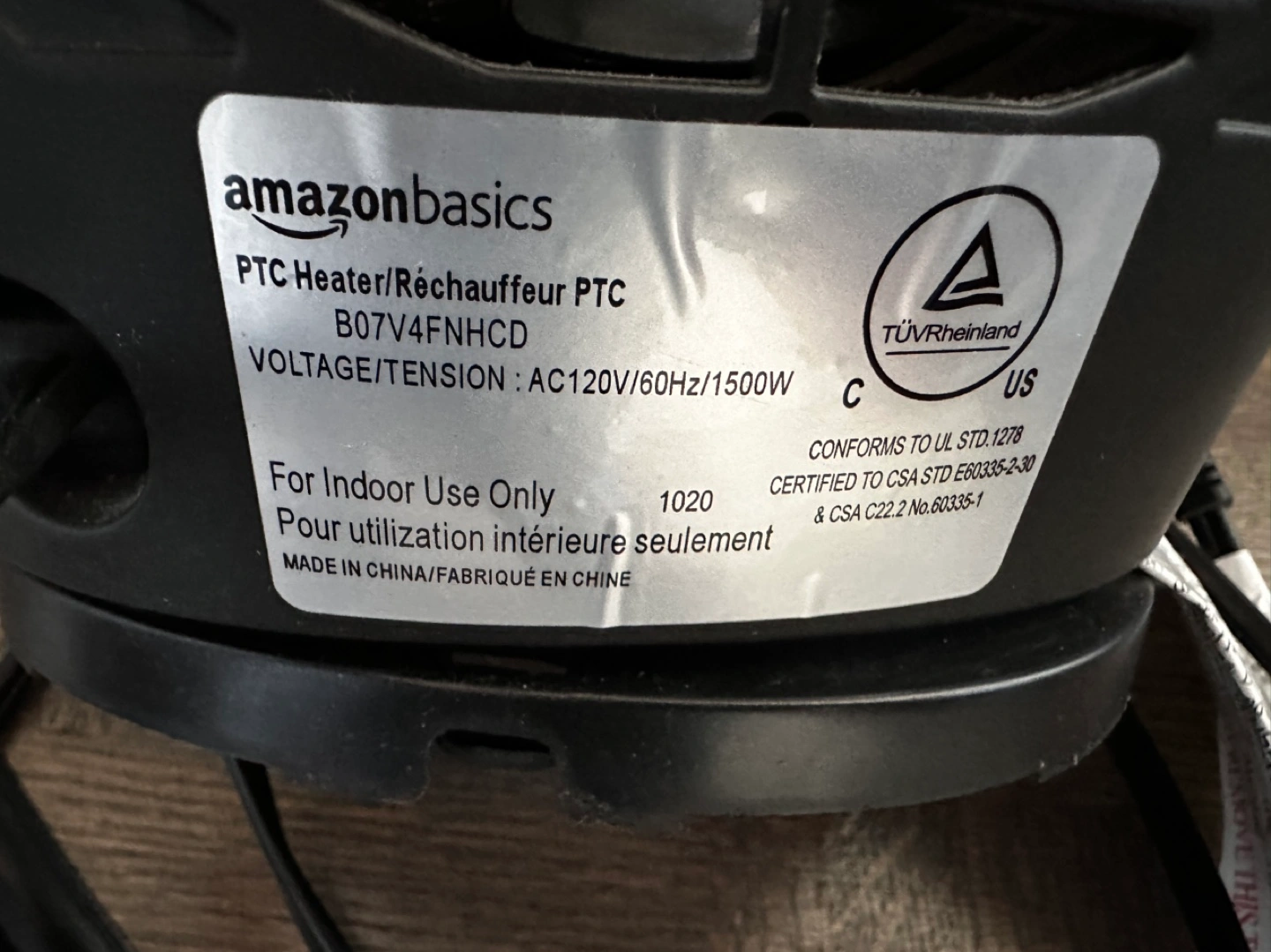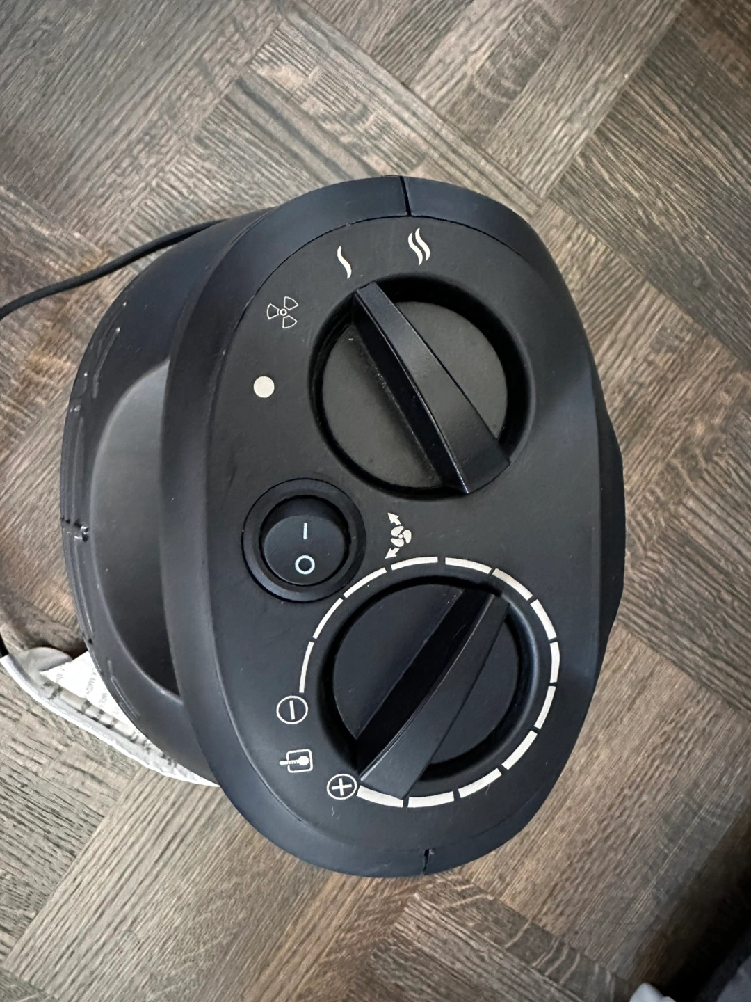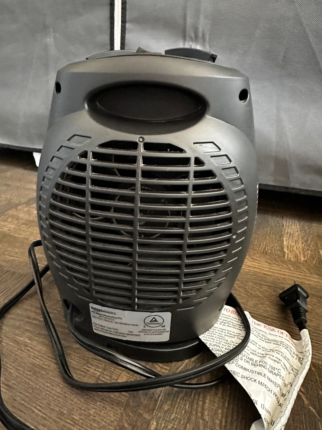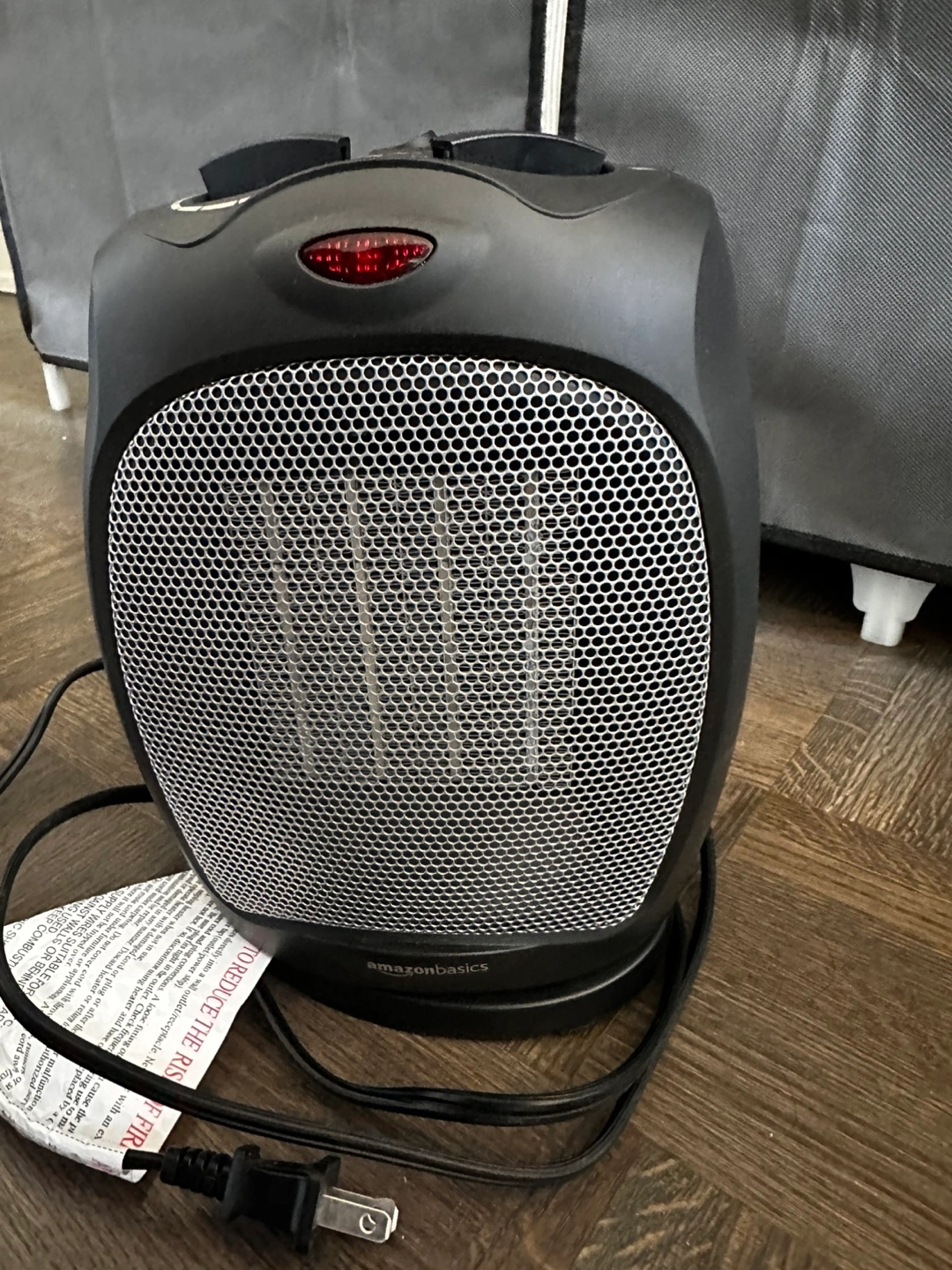 Compact personal heater. Black plastic casing. Multiple heat settings. Indoor use only. Includes power cord. Oscillating ceramic space heater With overheat and tip over protection, Thermostat, 1500W, Black, 7.52”D x 6.34”W x 9.45”H It also has option for fan only for air circulation without heat ! Weight: 3.2 Pounds