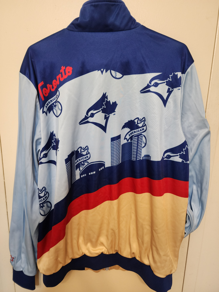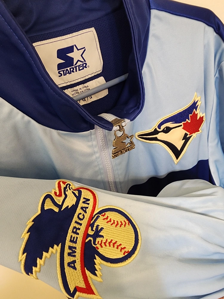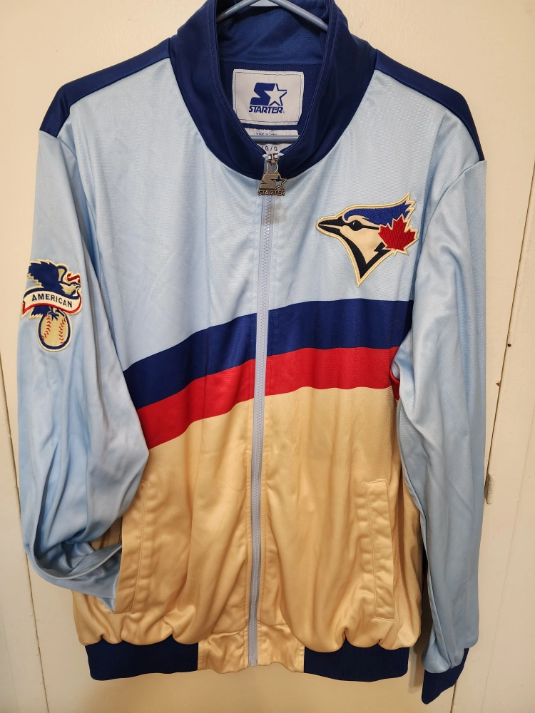Men's used size large Starter jacket. Features Toronto Blue Jays and American League logos. Colourful design. Full zip. Was in my storage.