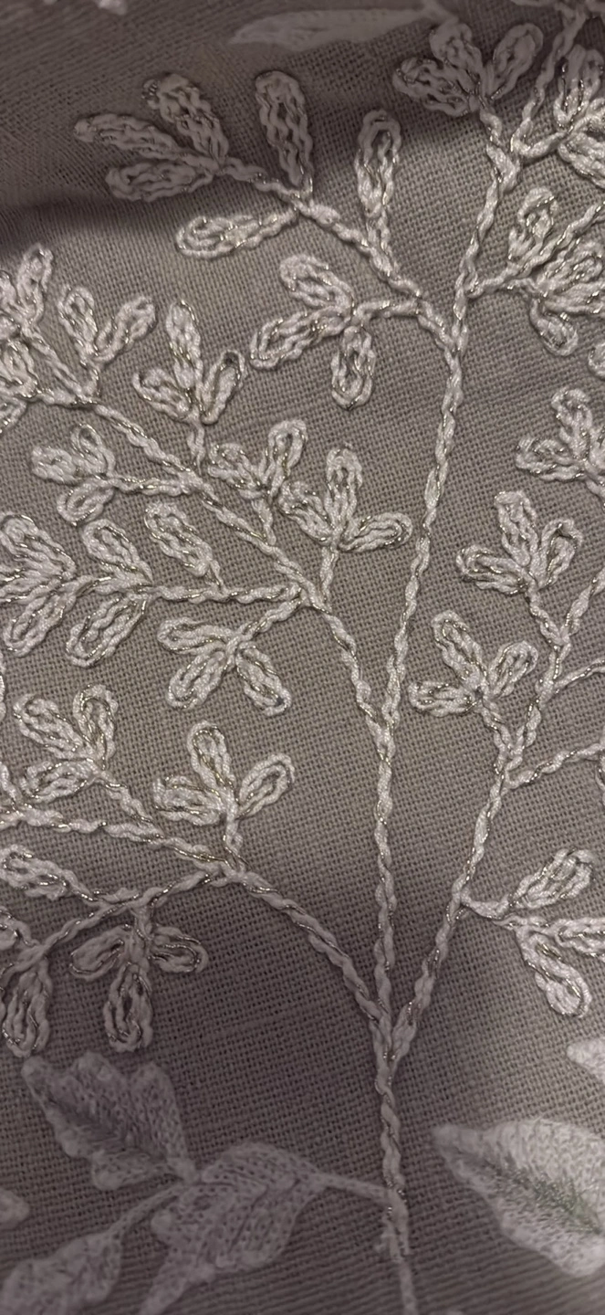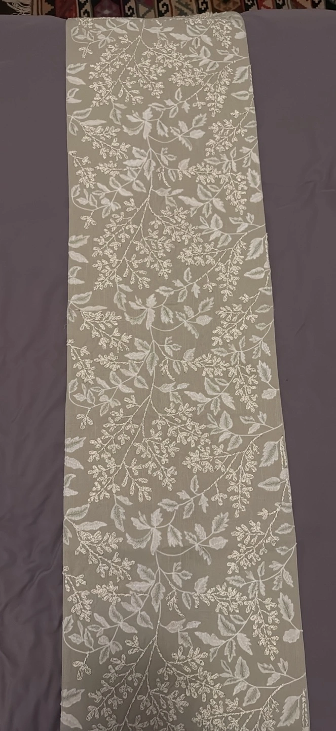 Beautiful sage green table runner. Features delicate floral embroidery. Adds elegance to any table setting. Light and airy fabric.