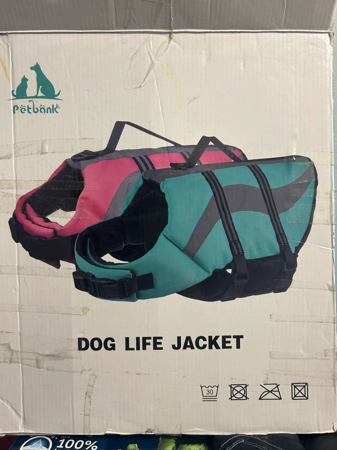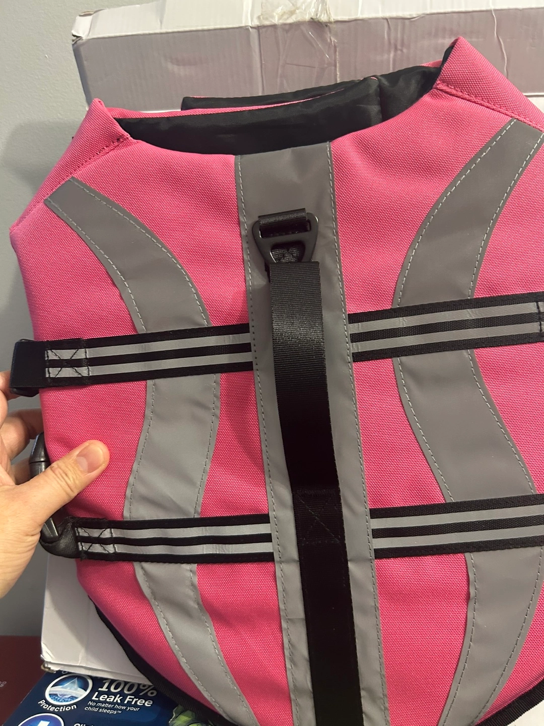 76Pink dog life jacket. Size large. Features reflective strips and bright colours. Durable and safe for water activities. Easy to adjust. Yonge and Steeles