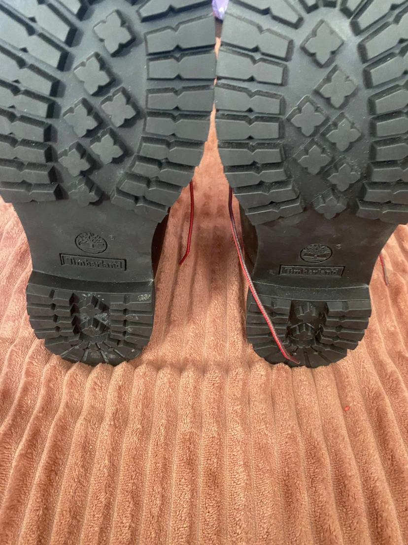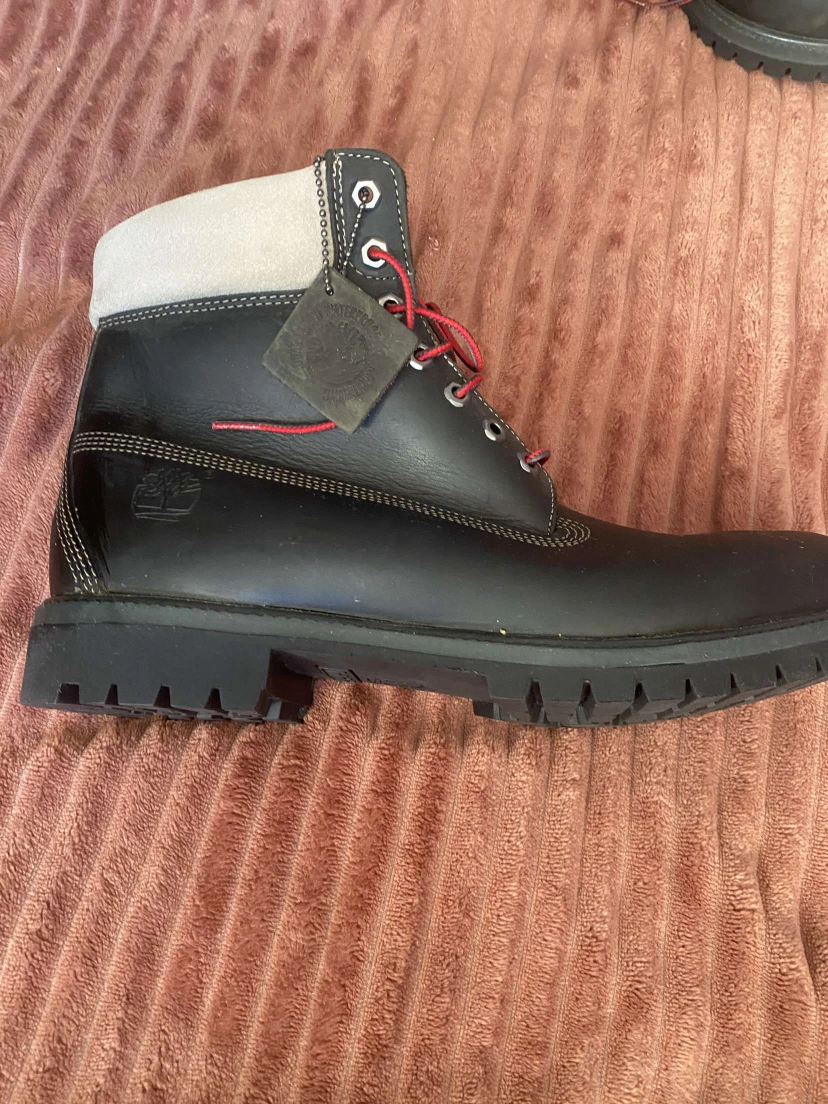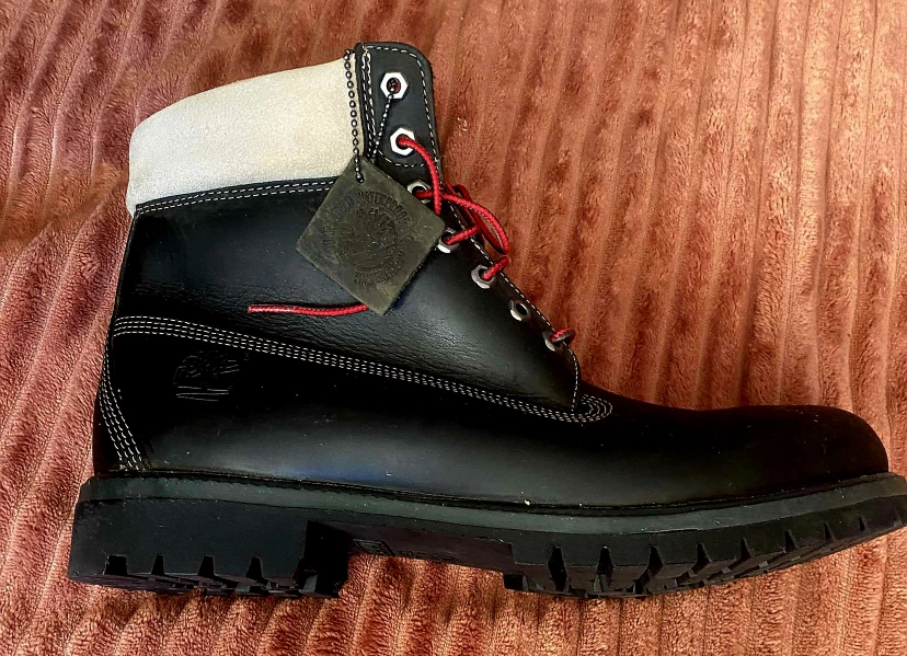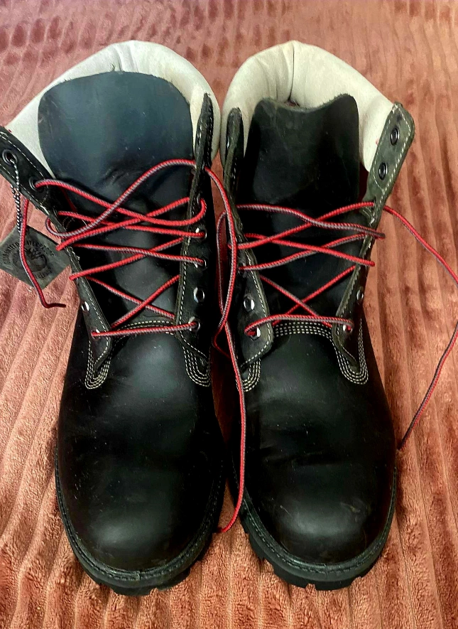 Men's Timberland 6-inch premium boots. Black leather upper, off-white collar. Red laces. Durable rubber sole. Great for everyday wear.