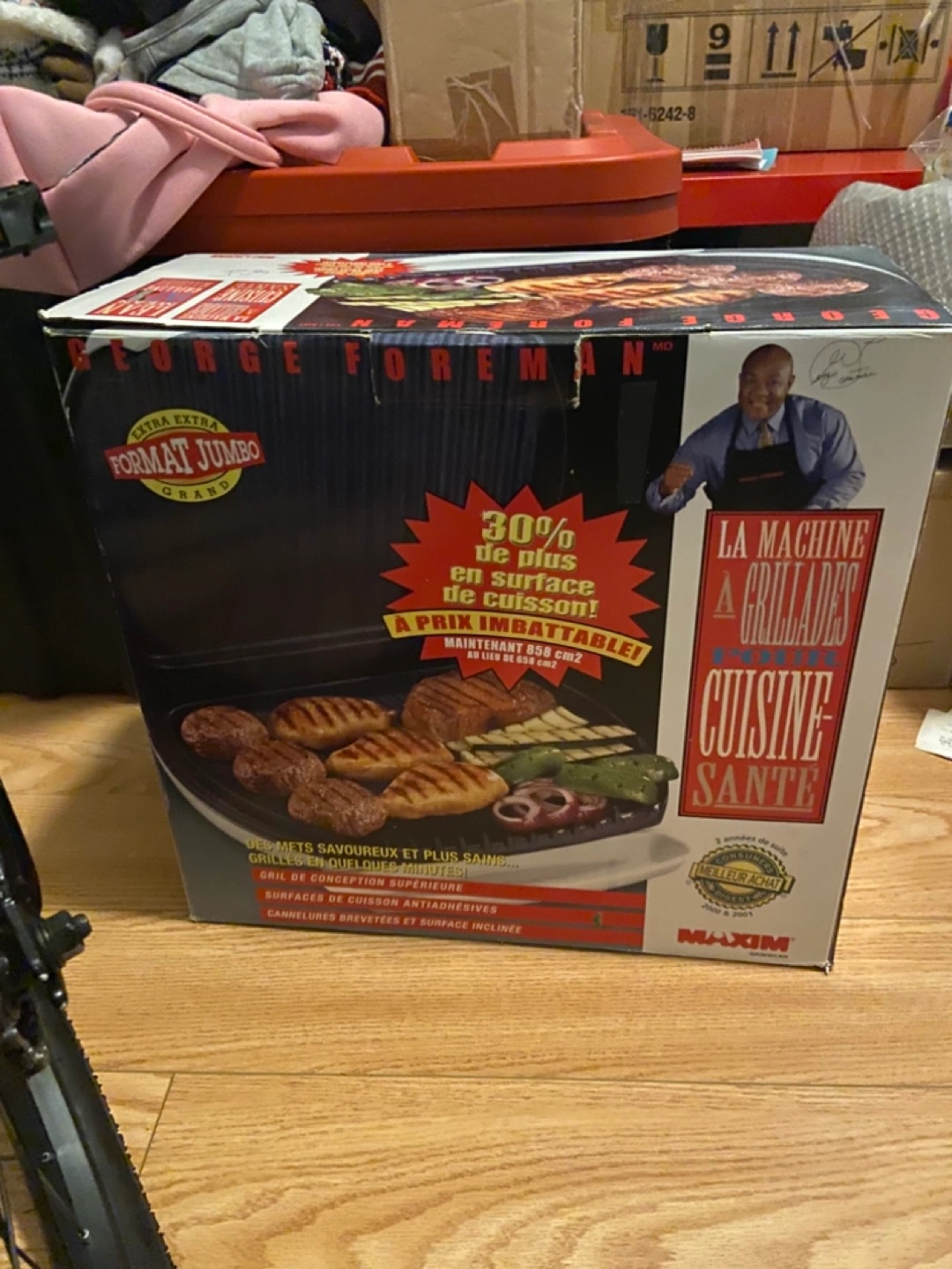 74New in box, George Foreman grill. Extra jumbo format. Features non-stick cooking surfaces, patented grooves, and an inclined surface. Cooks food quickly. Healthier cooking. Asking $75 firm