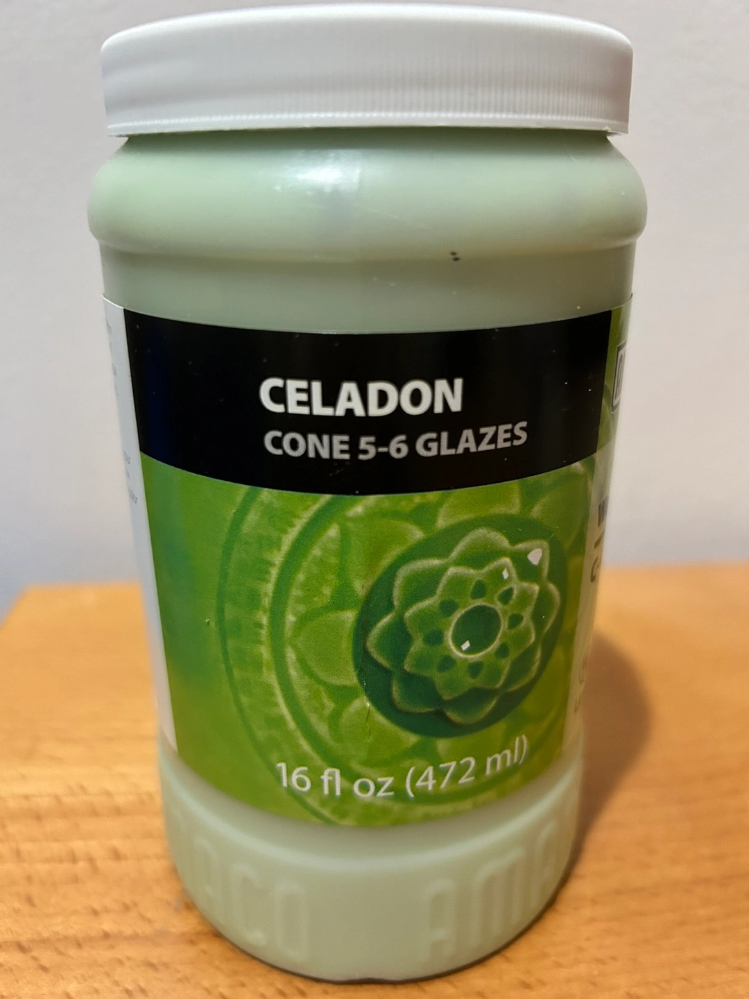 16 fl oz (472 ml) jar of AMACO Wasabi Celadon Cone 5-6 glaze. Lead-free and food safe. Non-toxic.