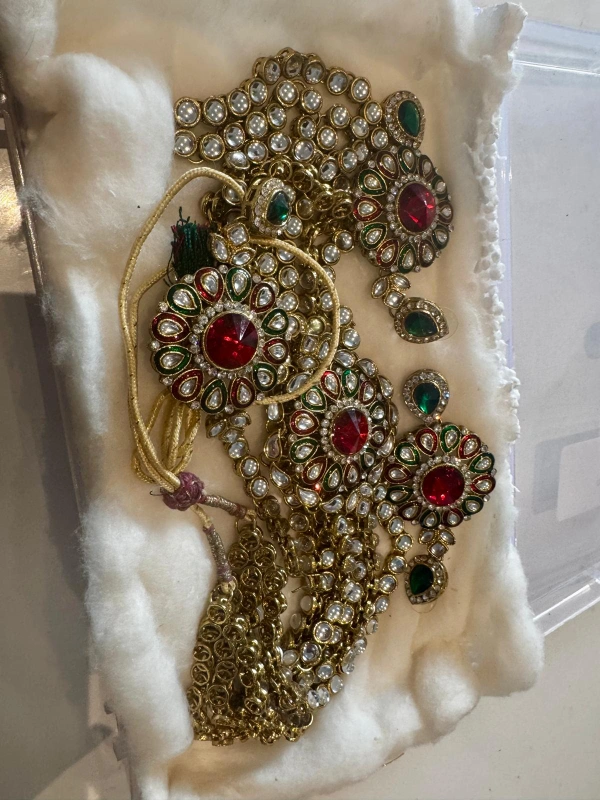 Beautiful collection of gold-toned Indian bridal jewellery. Includes a waist belt, earrings, hair accessories, and necklaces. Intricate designs, pearls, and colourful gemstones. Perfect for a special occasion.