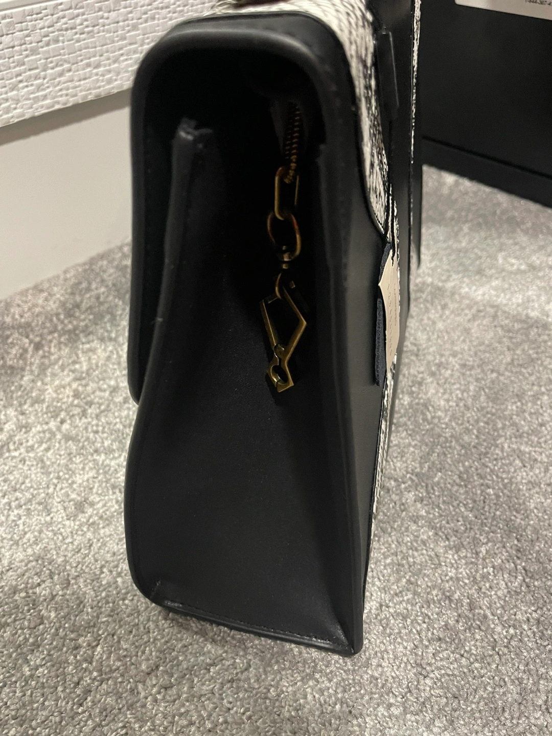 Elegant handbag. Black leather with white snakeskin accents. Gold-toned hardware. Top handle and shoulder strap. Looks new.