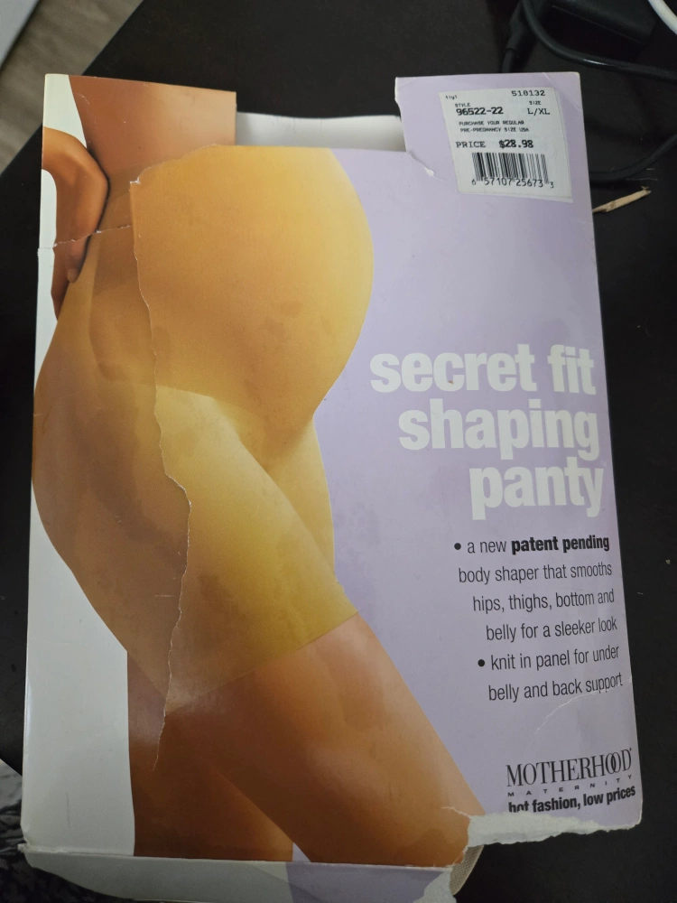 Secret Fit Shaping Panty. Smooths hips, thighs, bottom and belly. Knit in panel for under belly and back support. Size L/XL.