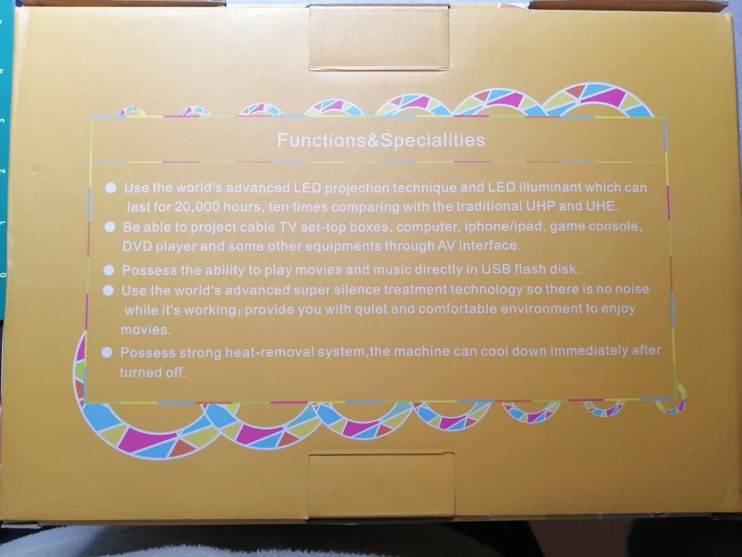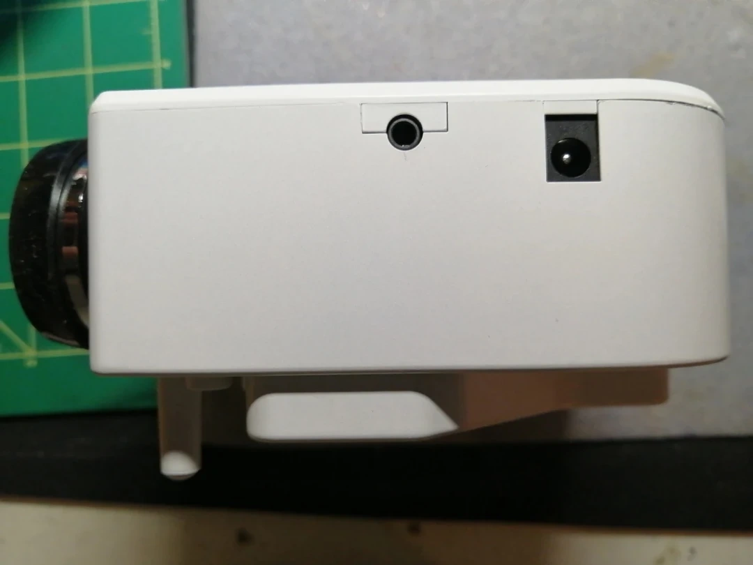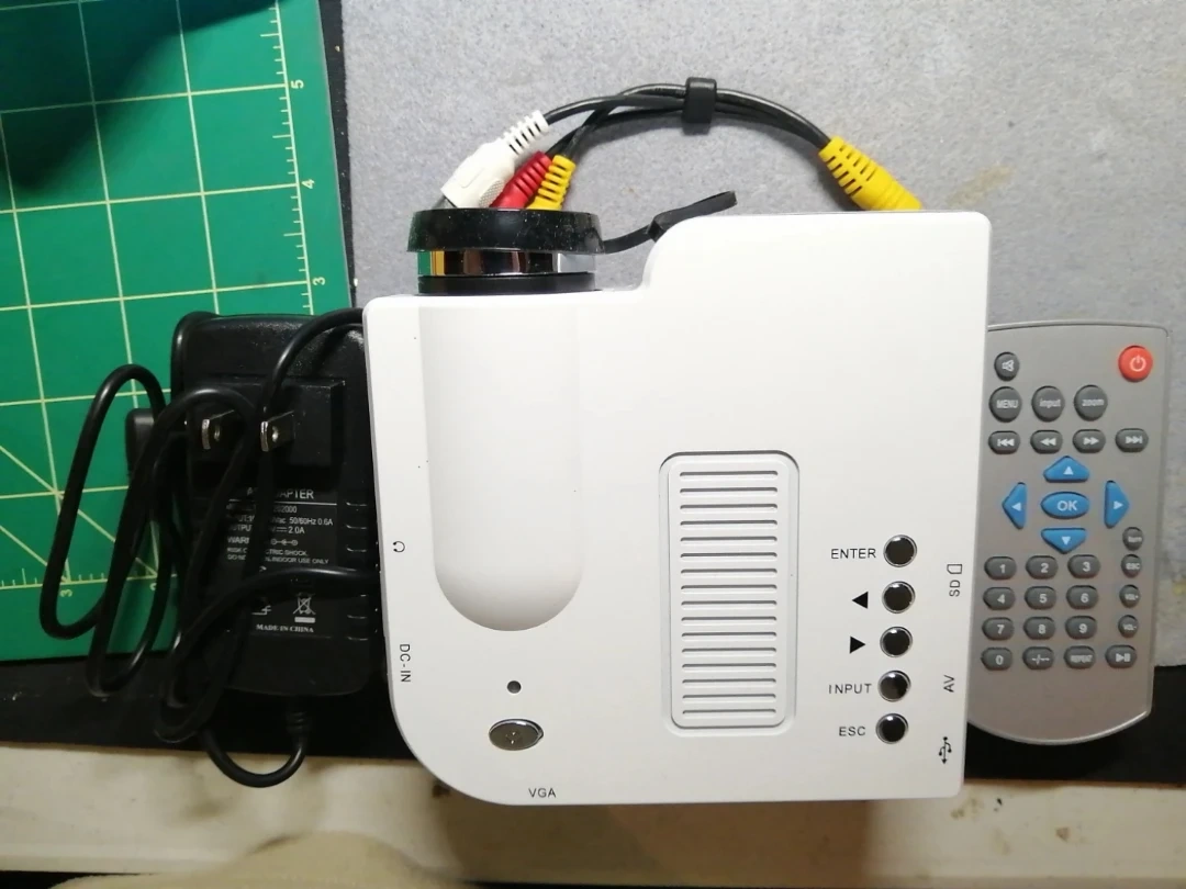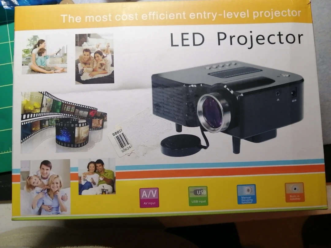 Compact LED projector. Plays movies and music from USB. Connects to computers, game consoles, and more. Quiet operation. Includes power adapter. Excellent for home use.