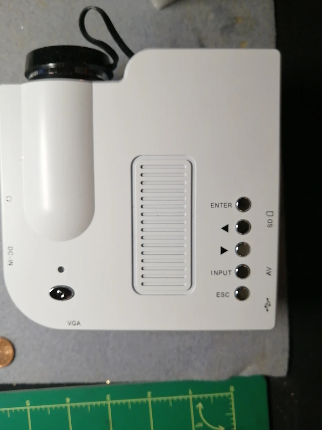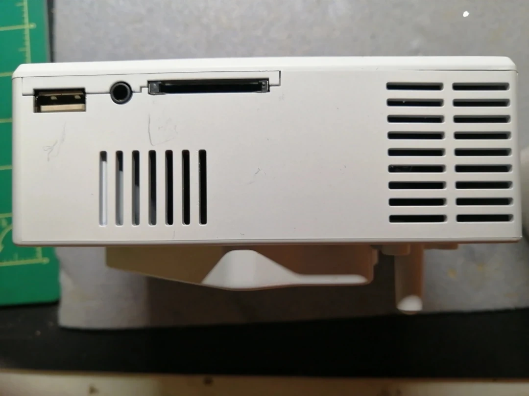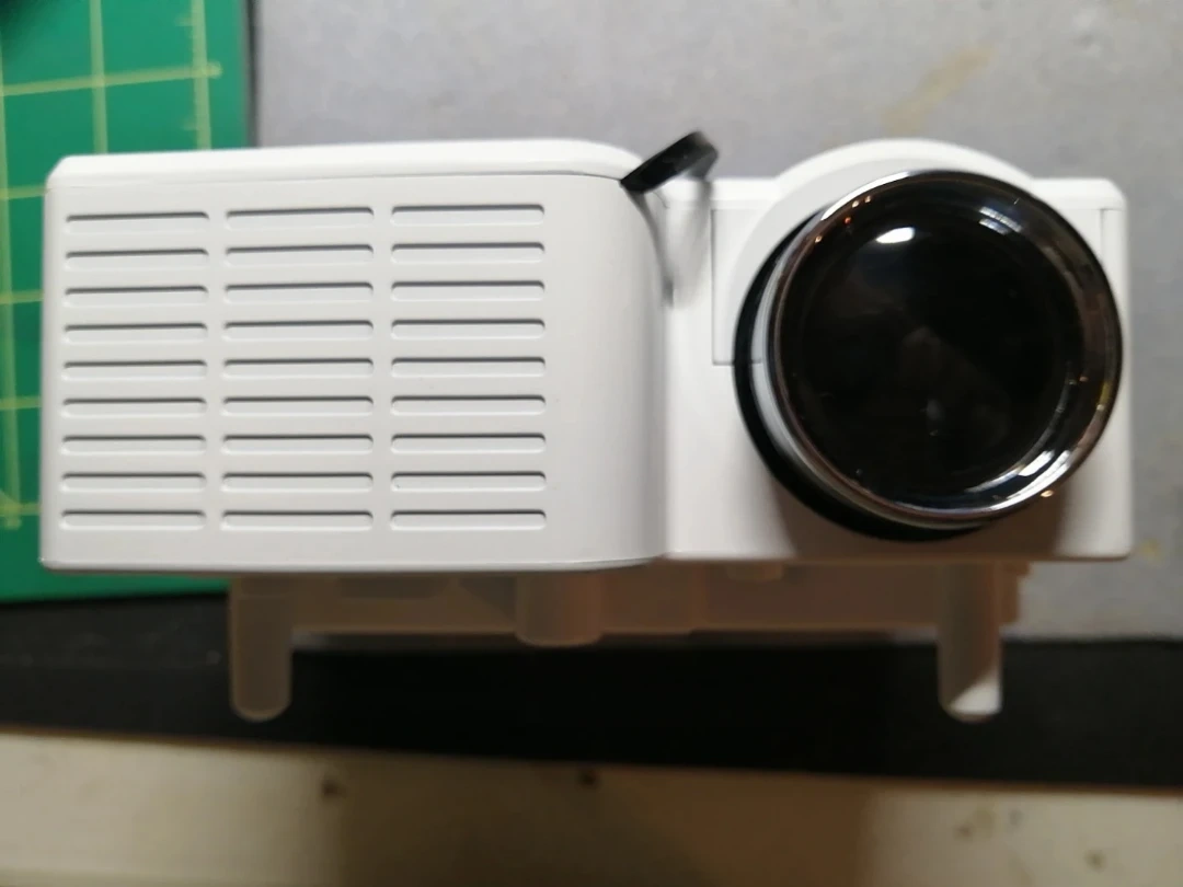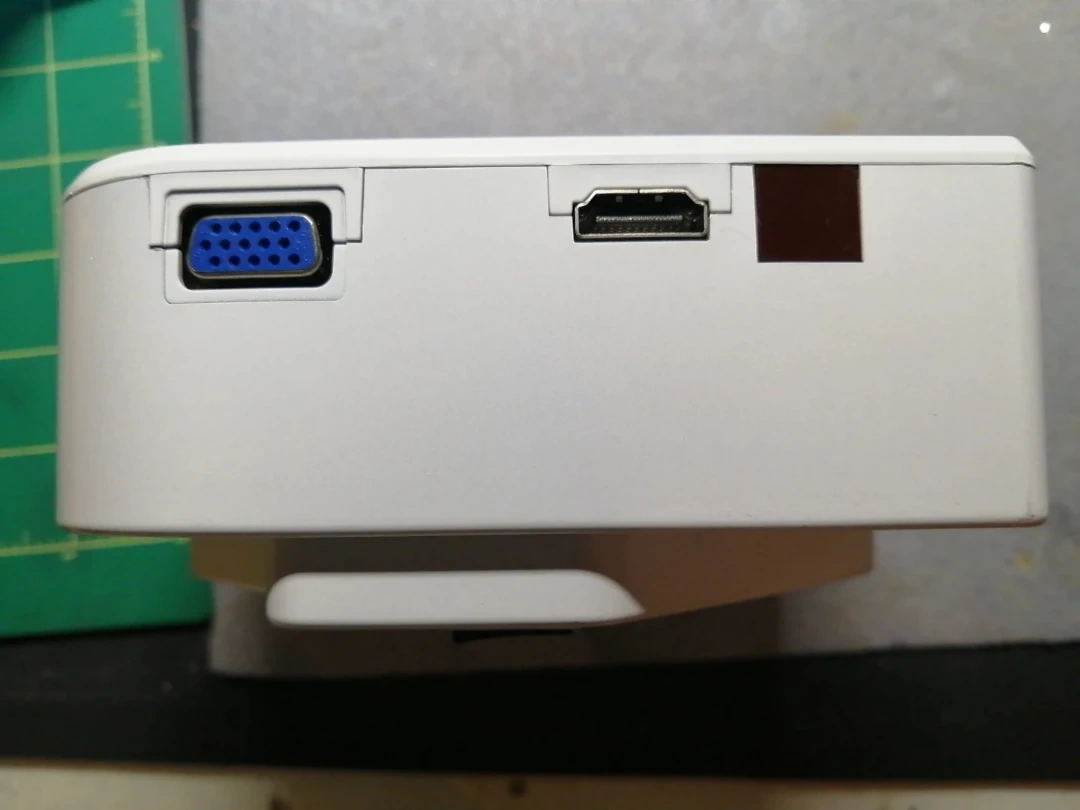 Compact LED projector. Plays movies and music from USB. Connects to computers, game consoles, and more. Quiet operation. Includes power adapter. Excellent for home use.