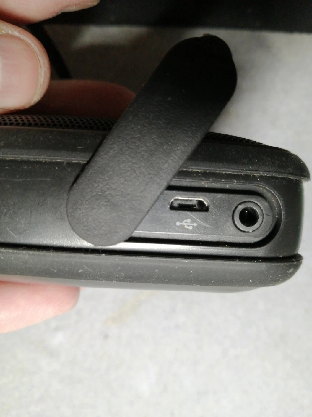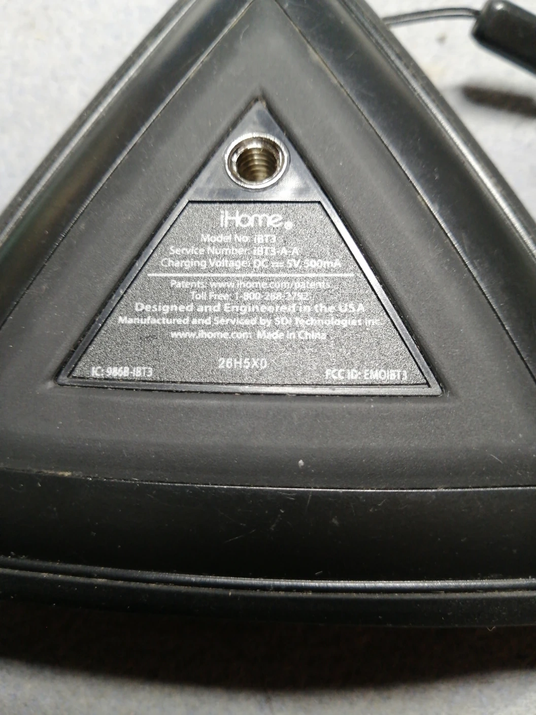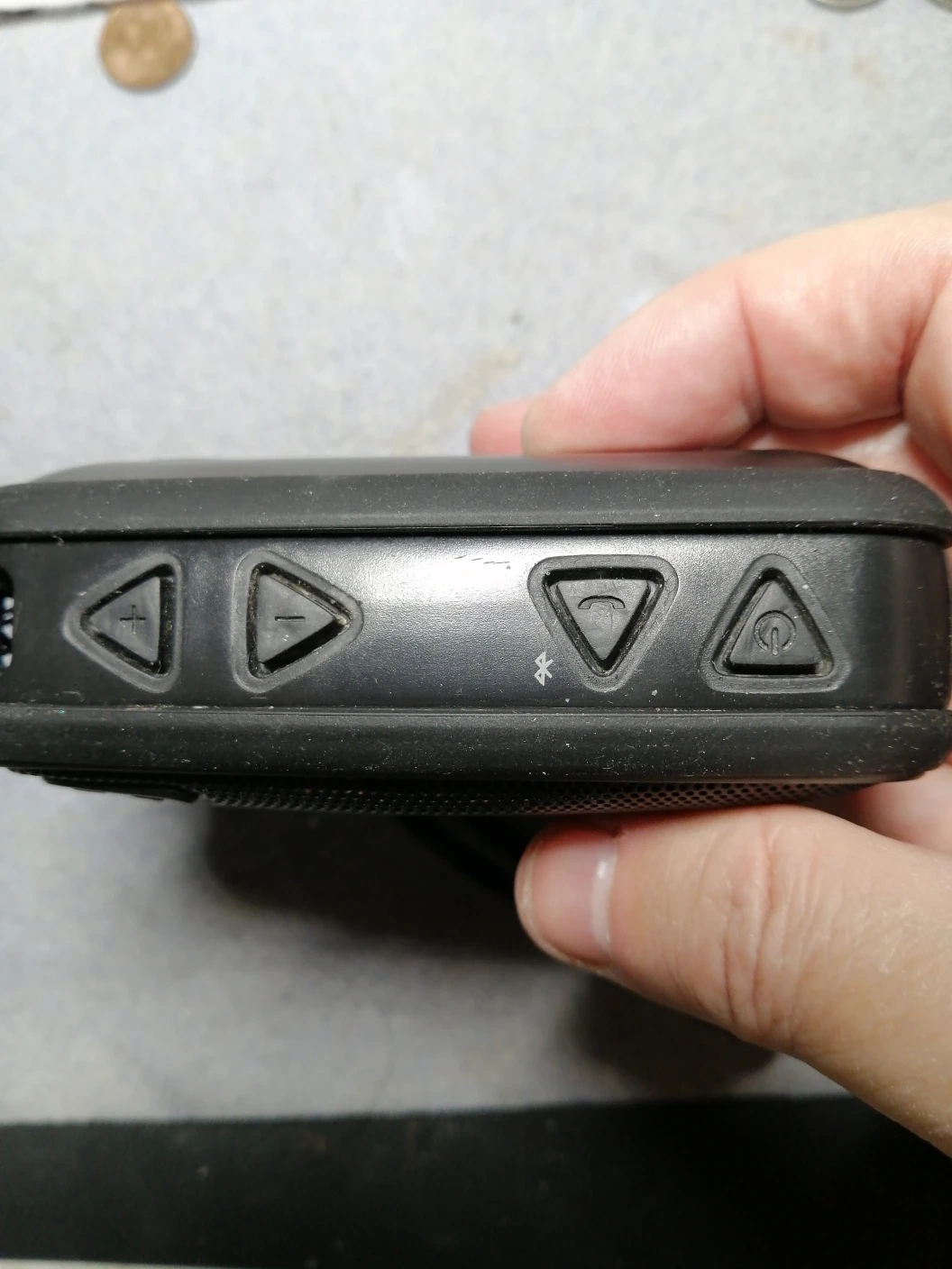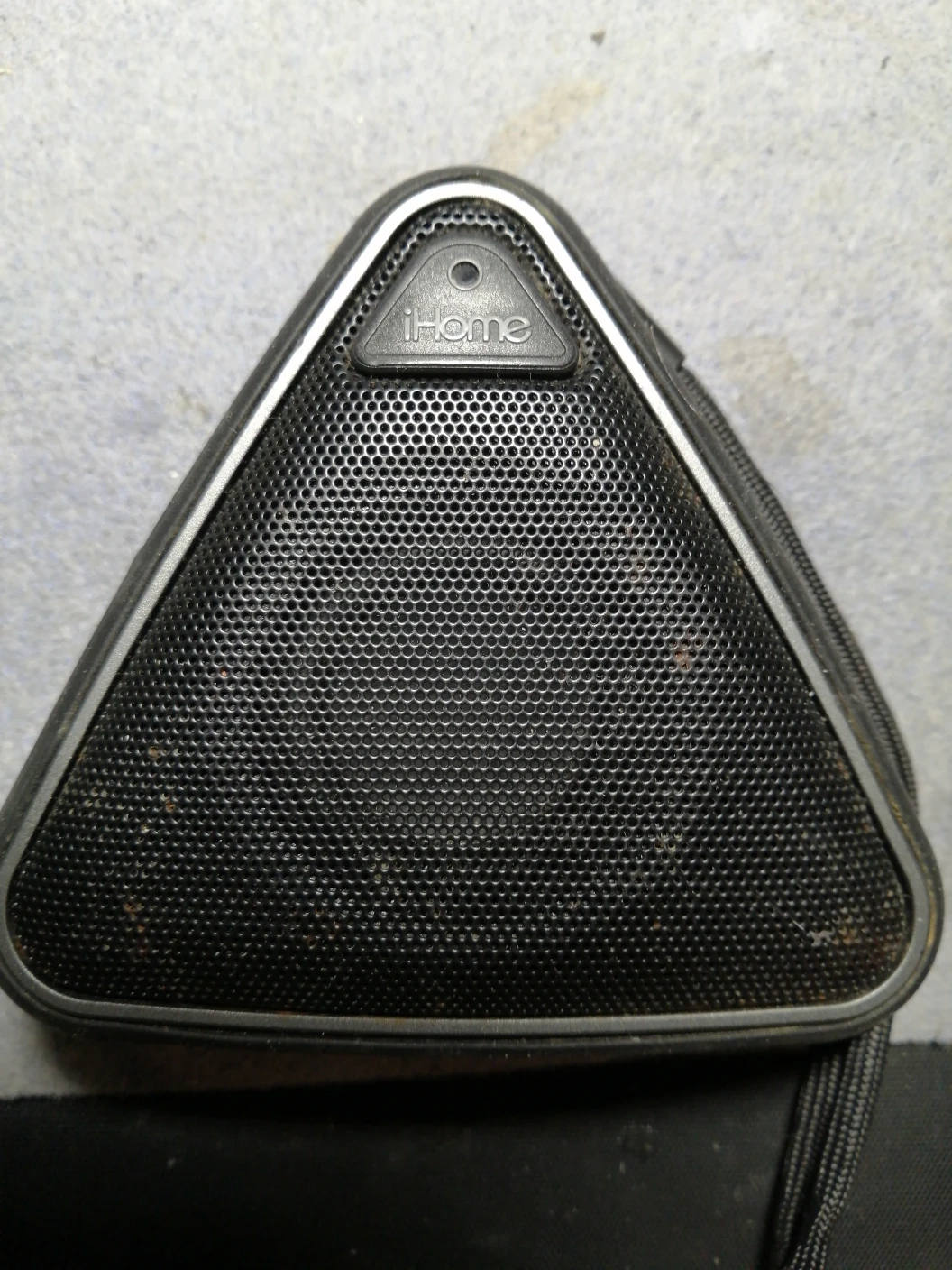 Portable Bluetooth speaker. Triangular shape. Black with grey accents. Features volume control buttons, play/pause, and Bluetooth pairing button. Micro USB charging port and 3.5 mm aux input. Small and lightweight.