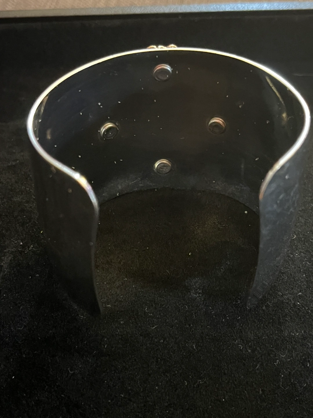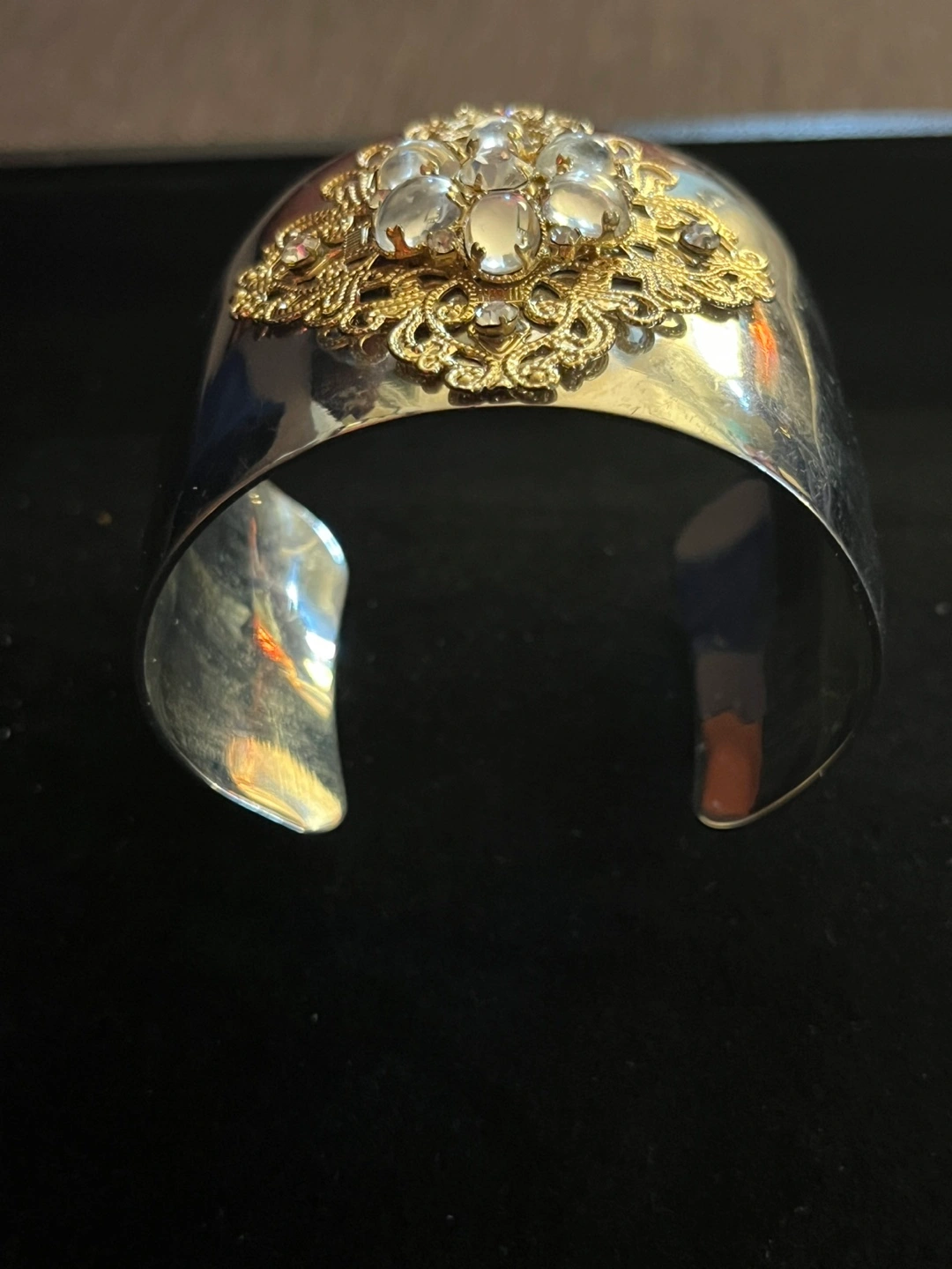 Stunning cuff bracelet. Features a gold filigree design accented with clear cabochon crystals. Silver-toned metal band. Unique statement piece.