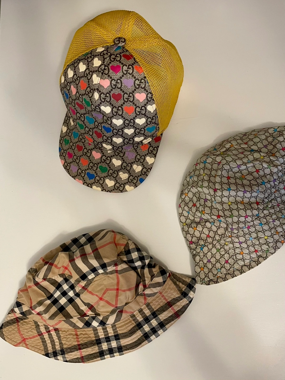 Three children's hats. One yellow and beige Gucci baseball cap with colourful hearts. One beige Gucci bucket hat with colourful stars. One Burberry bucket hat. Sizes vary.