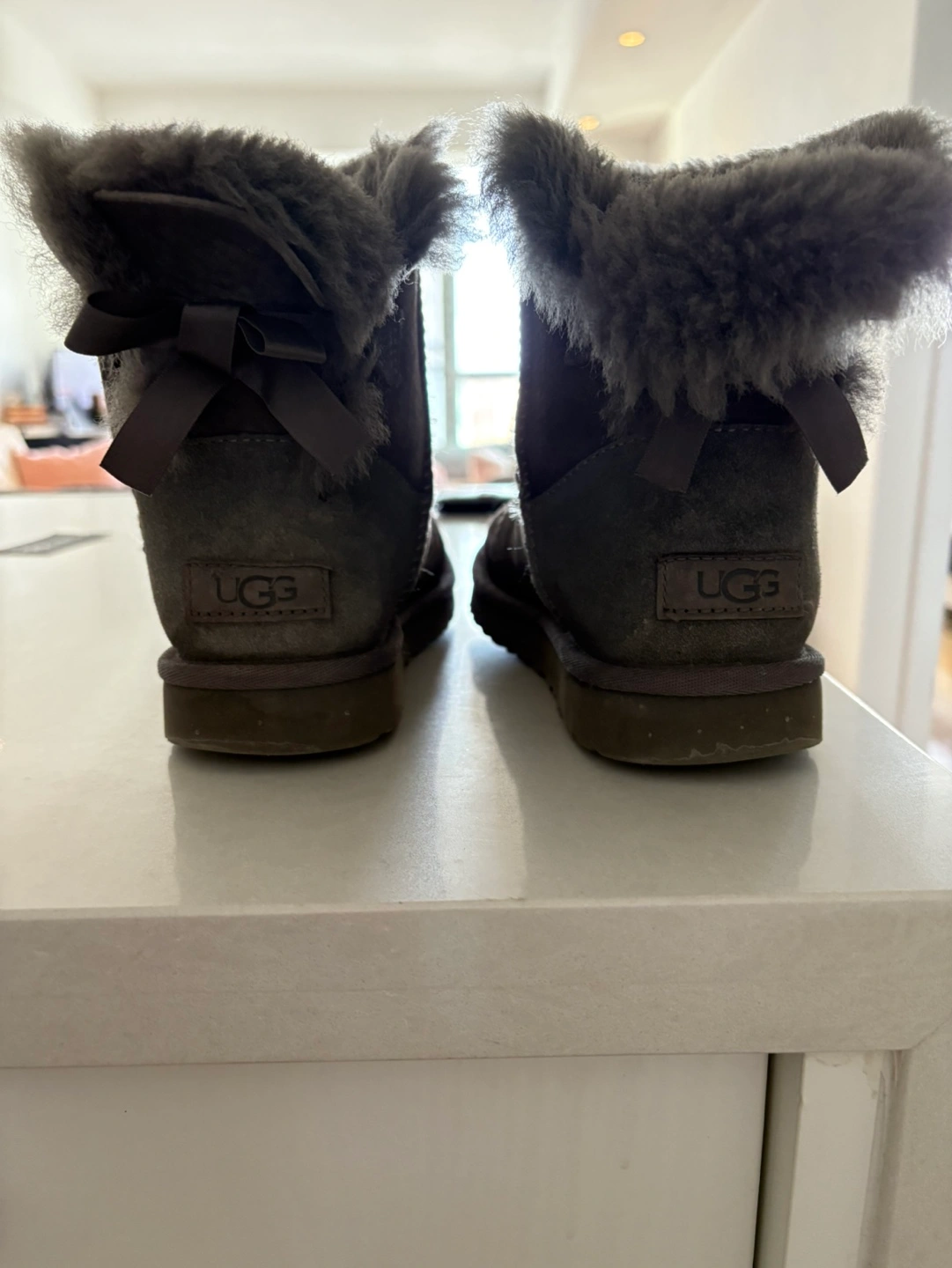 Adorable grey suede UGG Bailey Bow II boots. Features a cute bow detail and soft sheepskin lining. Great for colder weather. Pre-owned, minor wear.