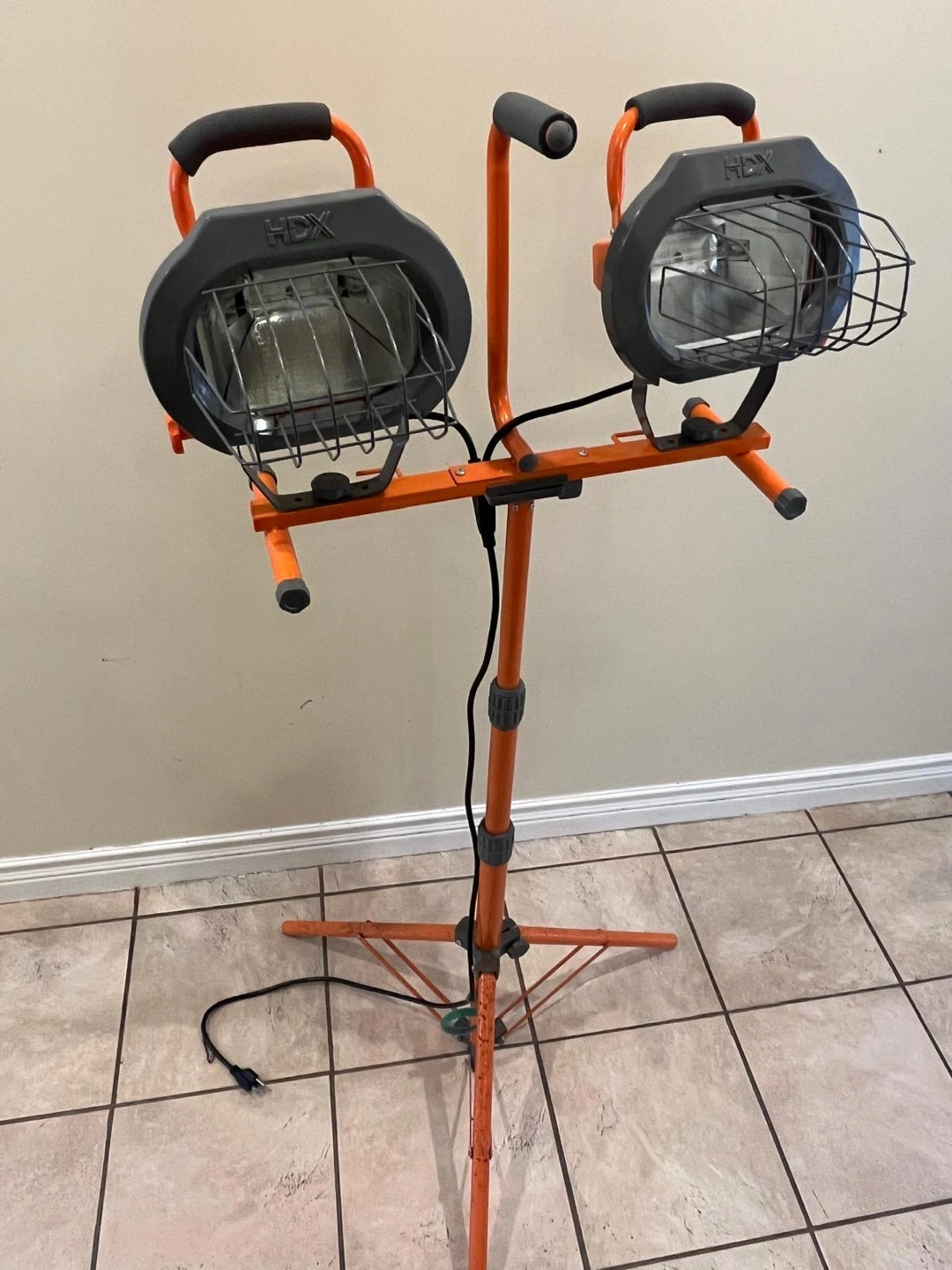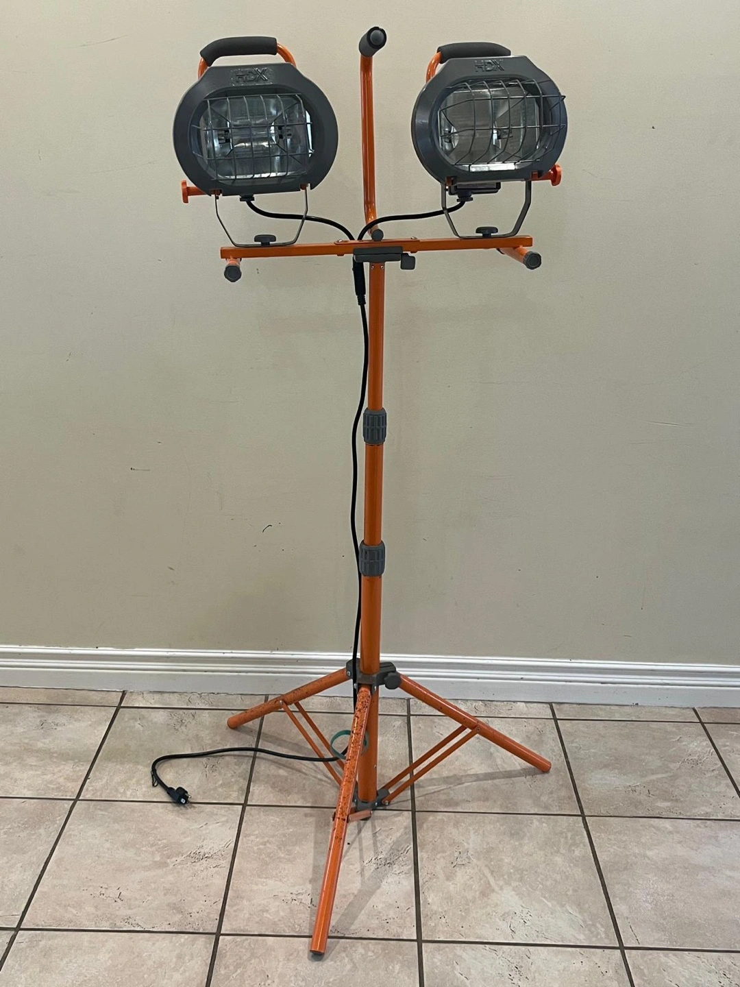Portable double work light. Features two halogen work lights mounted on an adjustable stand. Great for construction, outdoor use, or any project needing extra illumination.