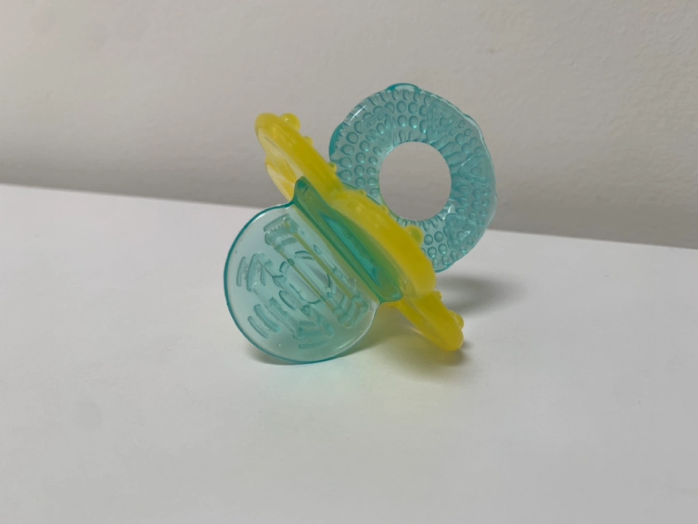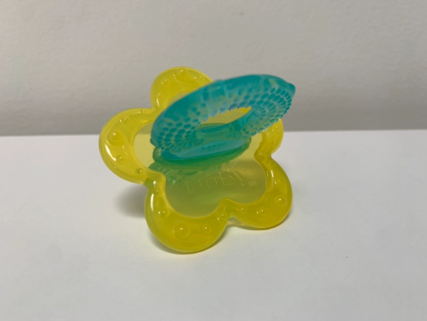 Flower-shaped baby teether. Soft and textured for soothing gums. Yellow and teal colours. Great for teething babies. We ended up finding this in our stash after it was needed.