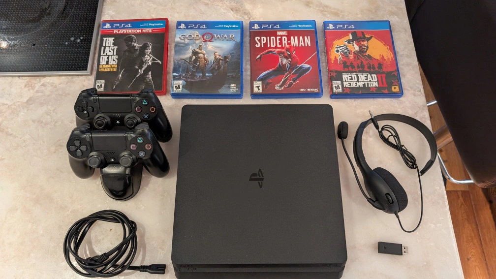 PlayStation 4 Slim console. Includes two controllers, charging station, wired headset, and four games: Red Dead Redemption 2, Marvel's Spider-Man, God of War, and The Last of Us Remastered. Great gaming bundle.