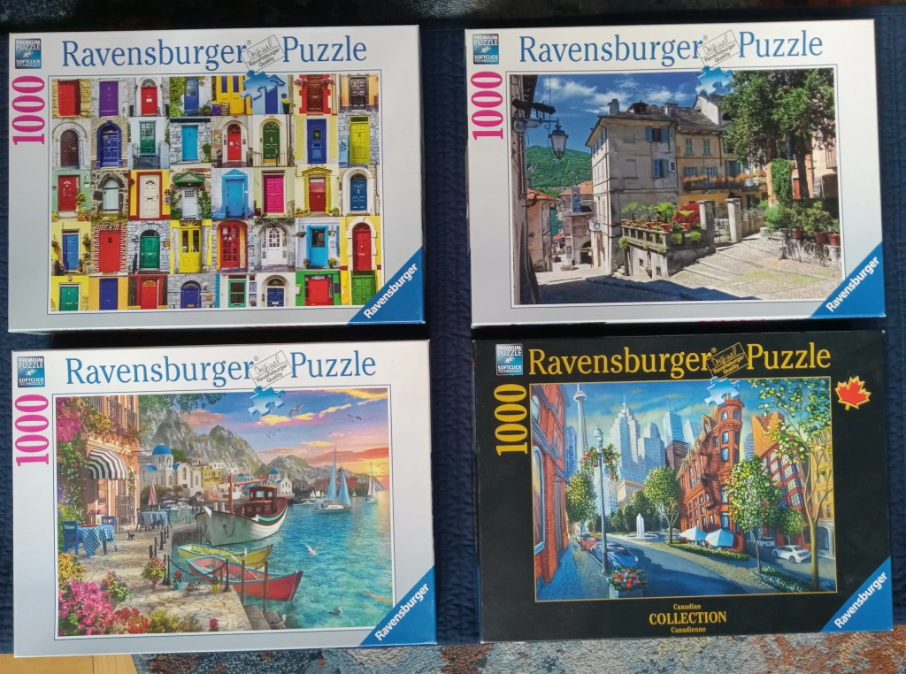 4 Ravensburger 1000 pc puzzles. No smoking, no pets home. Harbour scene is the only one I can't guarantee as complete. Not selling separately. I might throw in an extra puzzle if you're nice. 😉