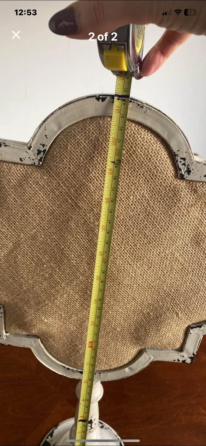 Ornate wood frame. Burlap backing. White distressed finish. Pedestal base. Perfect for displaying photos, jewelry, or small items.kids , baby , home staging