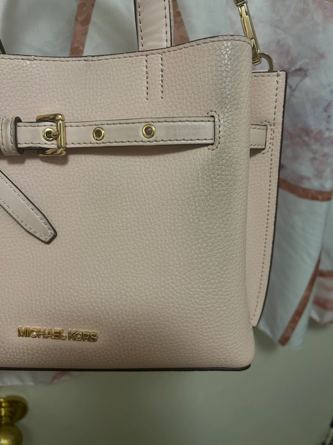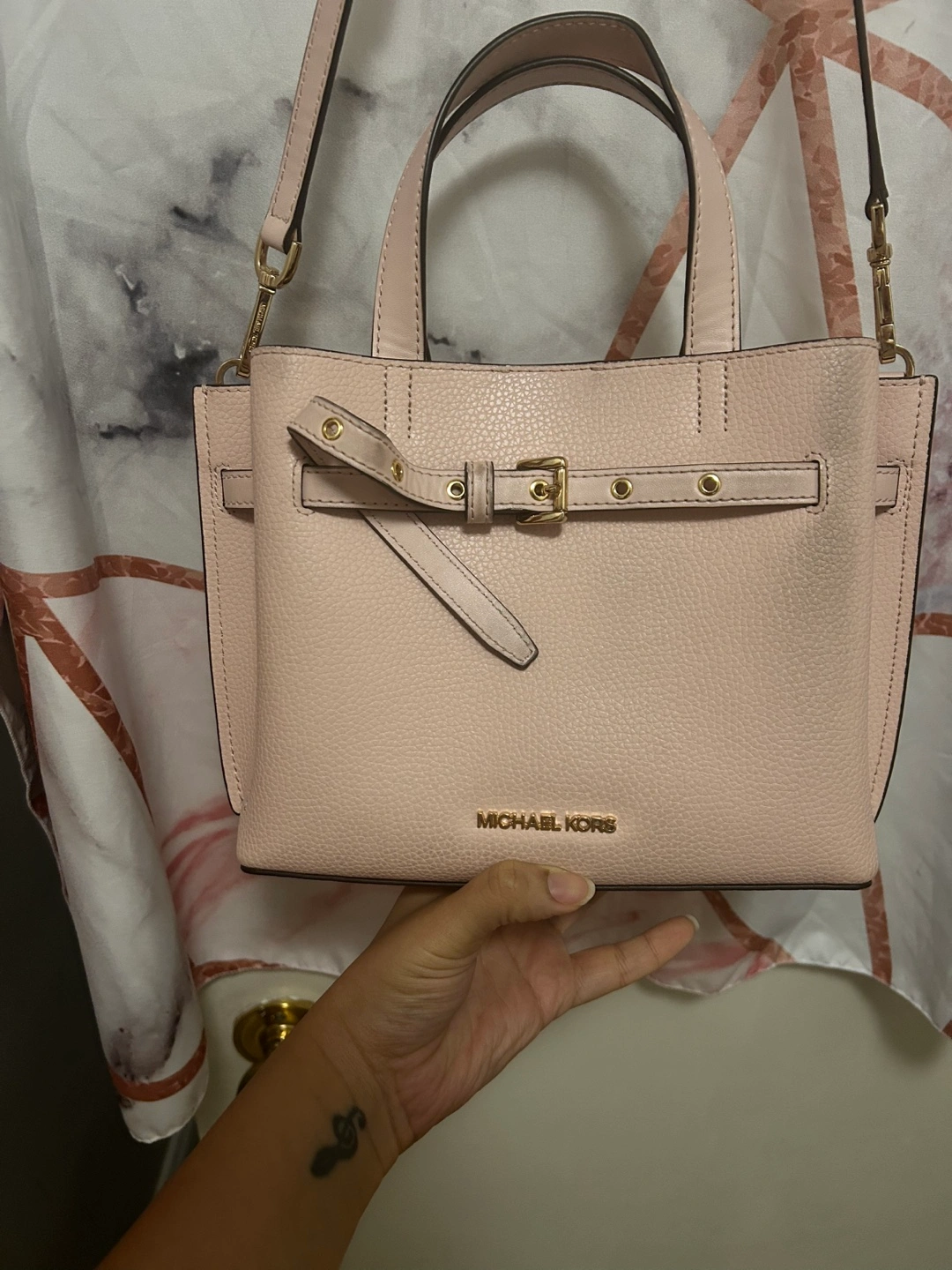 Adorable blush pink Michael Kors satchel. Features a buckle detail, top handles, and a detachable crossbody strap. Interior pockets. Great for everyday use.
