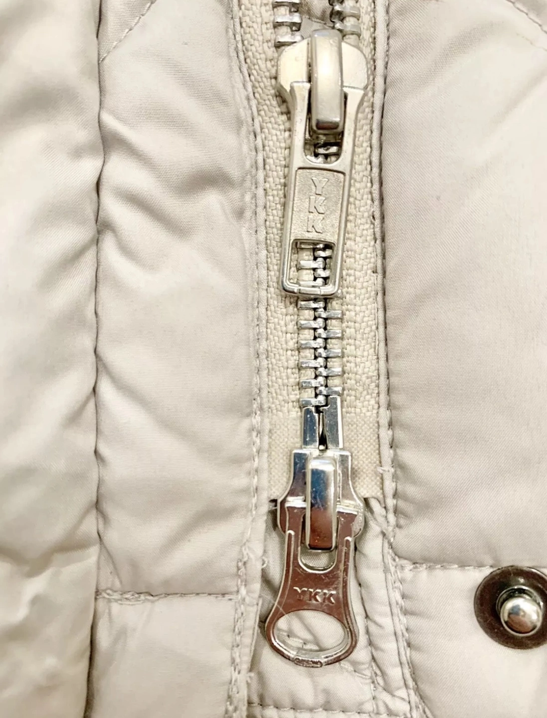 White goose down filling and coyote fur hood (fur and hood are both separately removable).