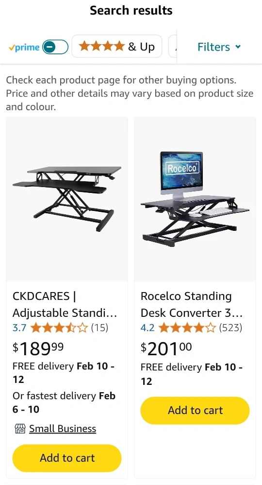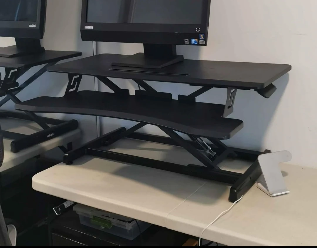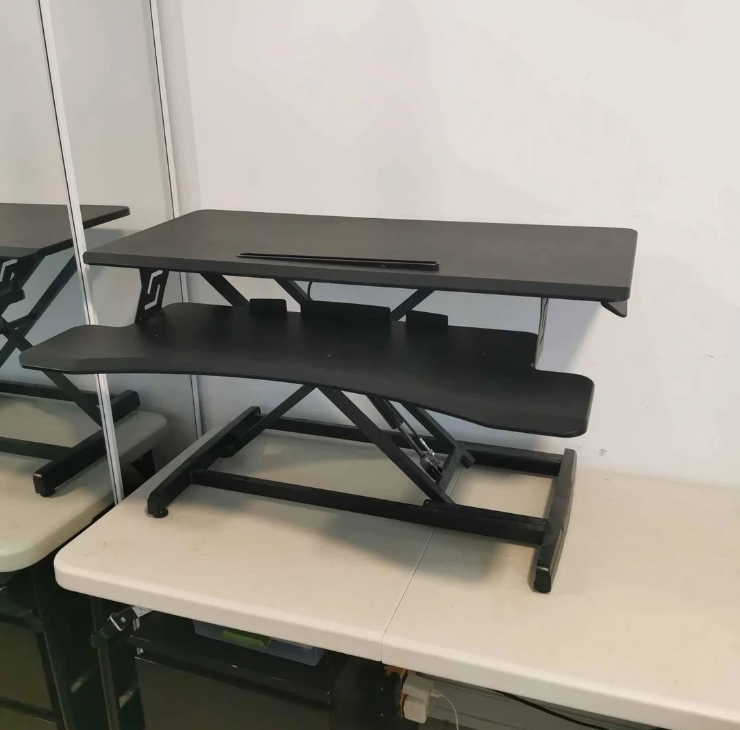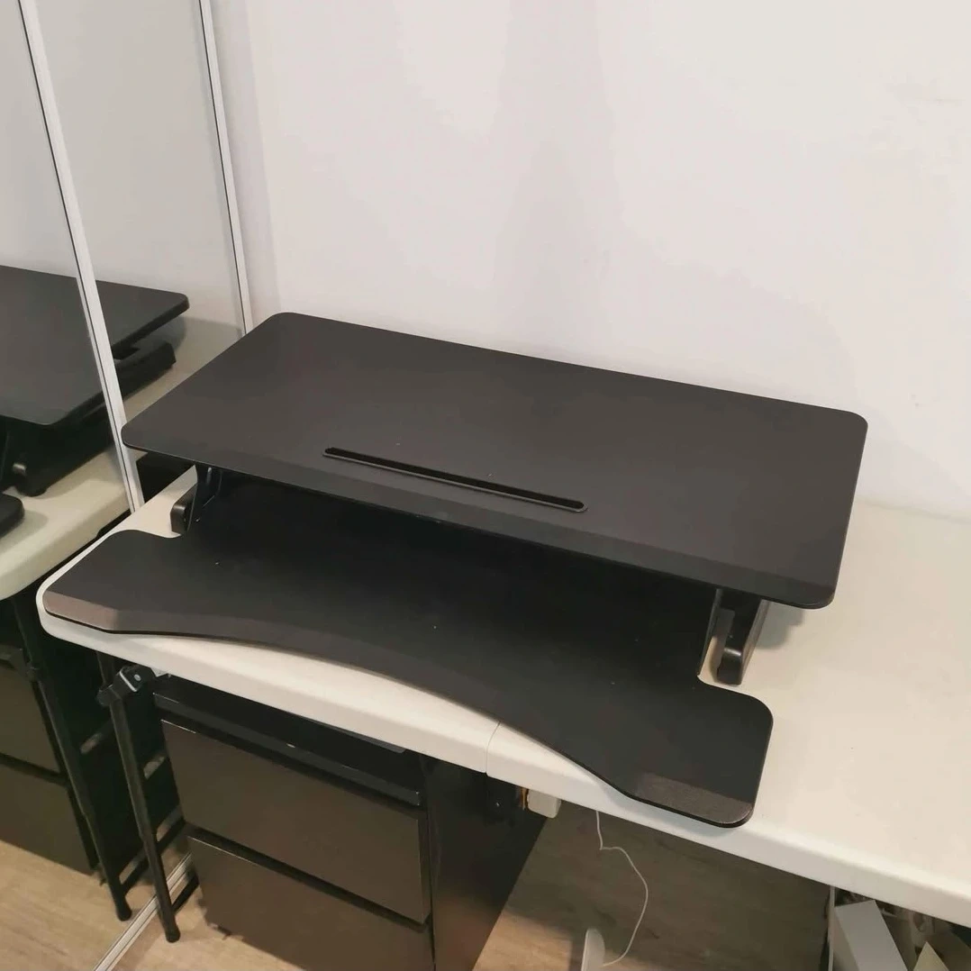 Black standing desk converter. Two-tier design. Easy height adjustment. Great for home or office use. Durable construction. Compact design.